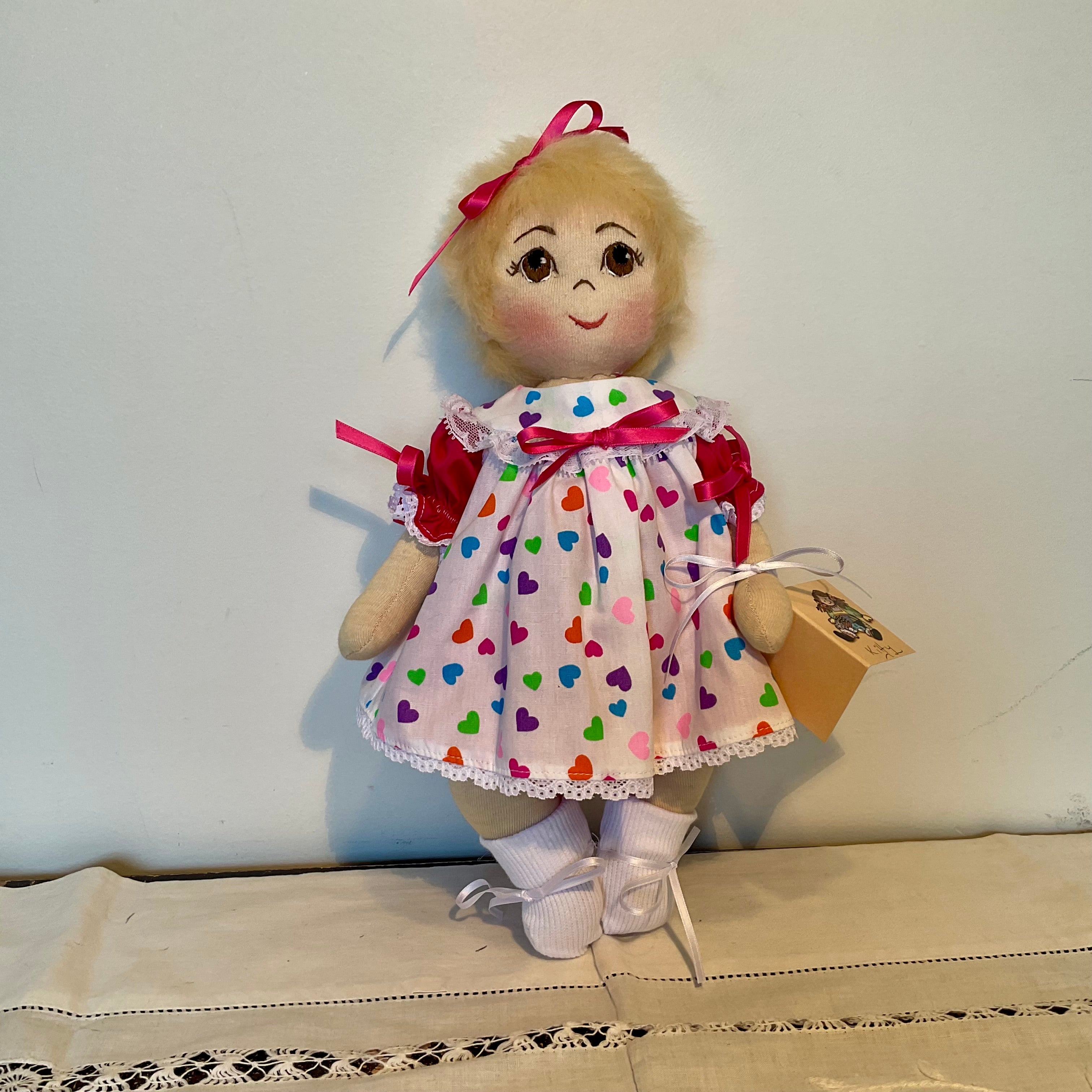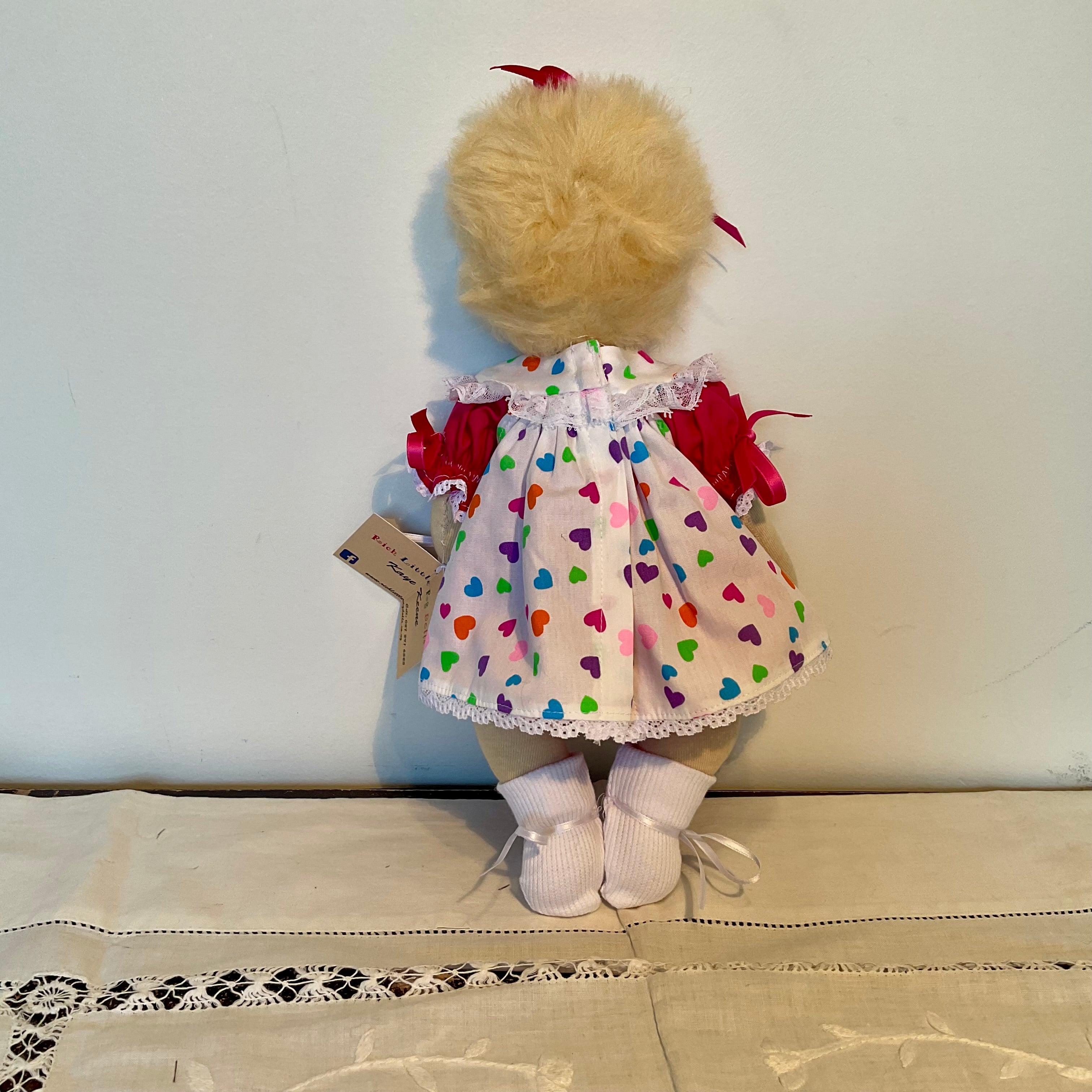 Kitty has brown eyes and blonde FauxFur fabric hair and is wearing a bright pink underdress with puffed sleeves and matching panties. Her overdress or pinafore is in a pretty complimenting fabric featuring little hearts and a lace trimmed round yoke   It has a bow on the bodice and a matching ribbon in her hair.   She also wears white handmade sock/bootees. Kitty has attached arms and is easily dressed and undressed. She is washable and durable and suitable for all children