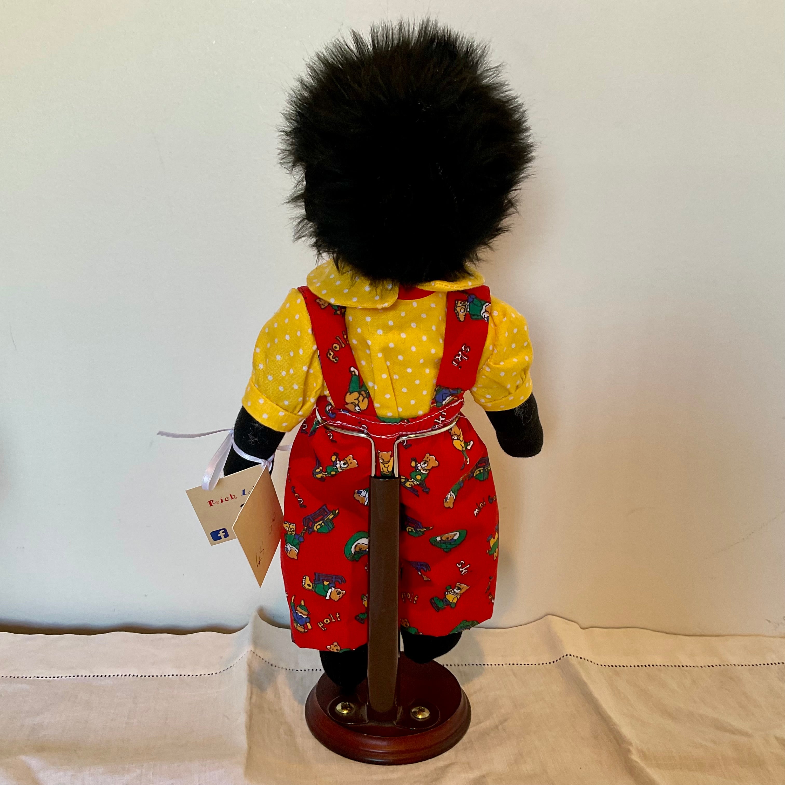 Tommy has brown eyes and black FauxFur hair and is wearing a very cute little shirt in yellow and white dots with a collar and cuffs and a red bow on his collar. He also wears red Teddy bear patterned long overalls with straps and hand made black sock bootees. Tommy has attached arms and is easily dressed and undressed he is washable and durable and suitable for all children.