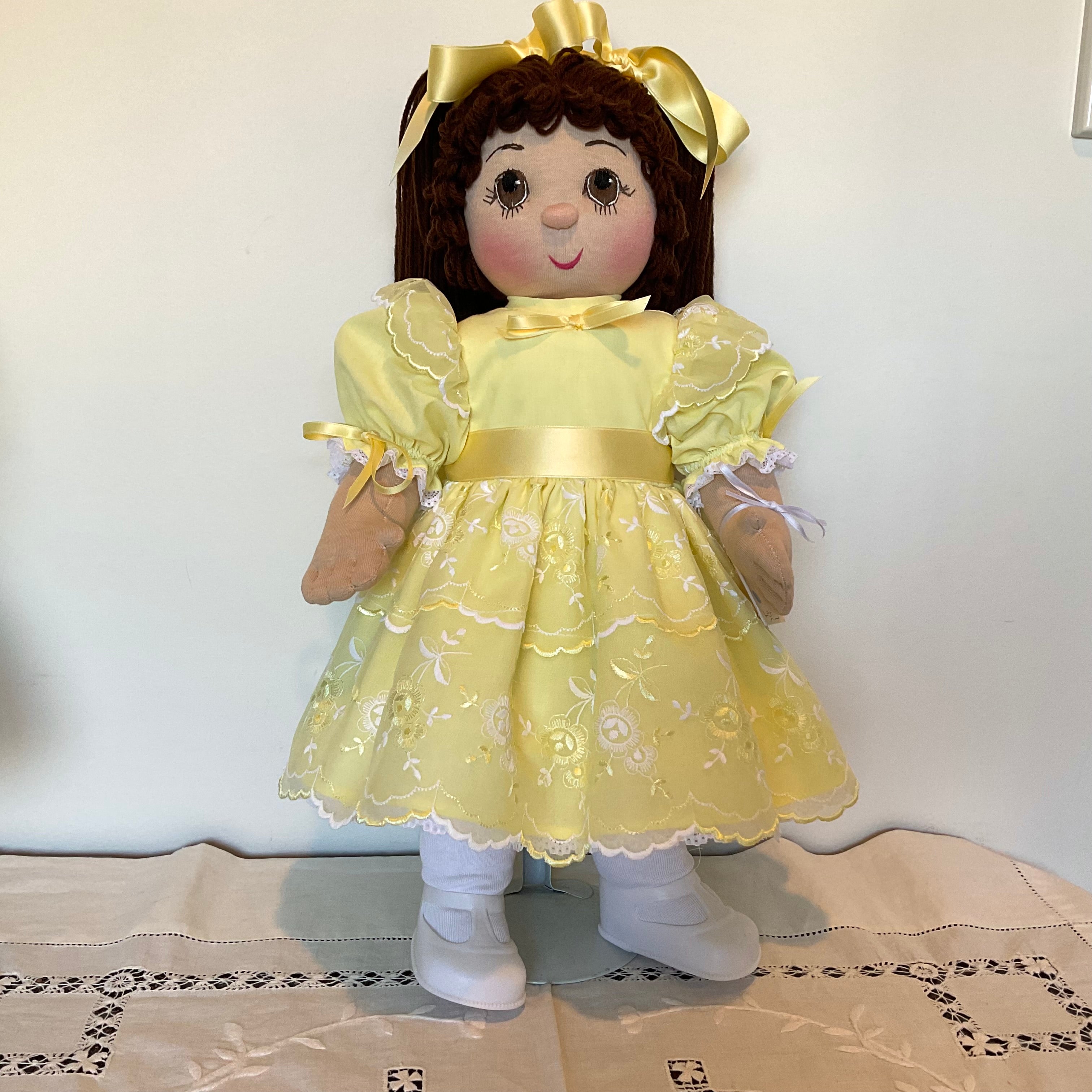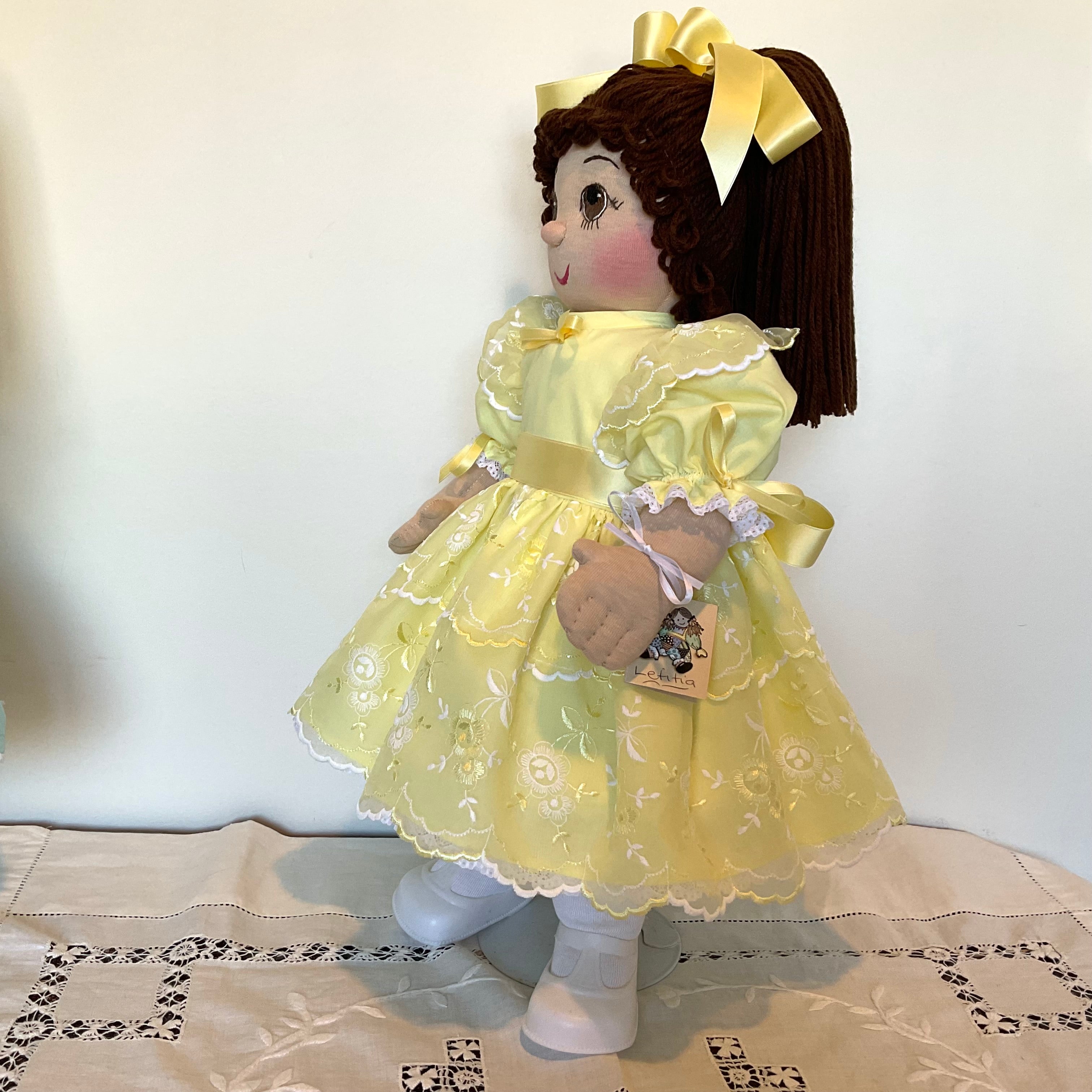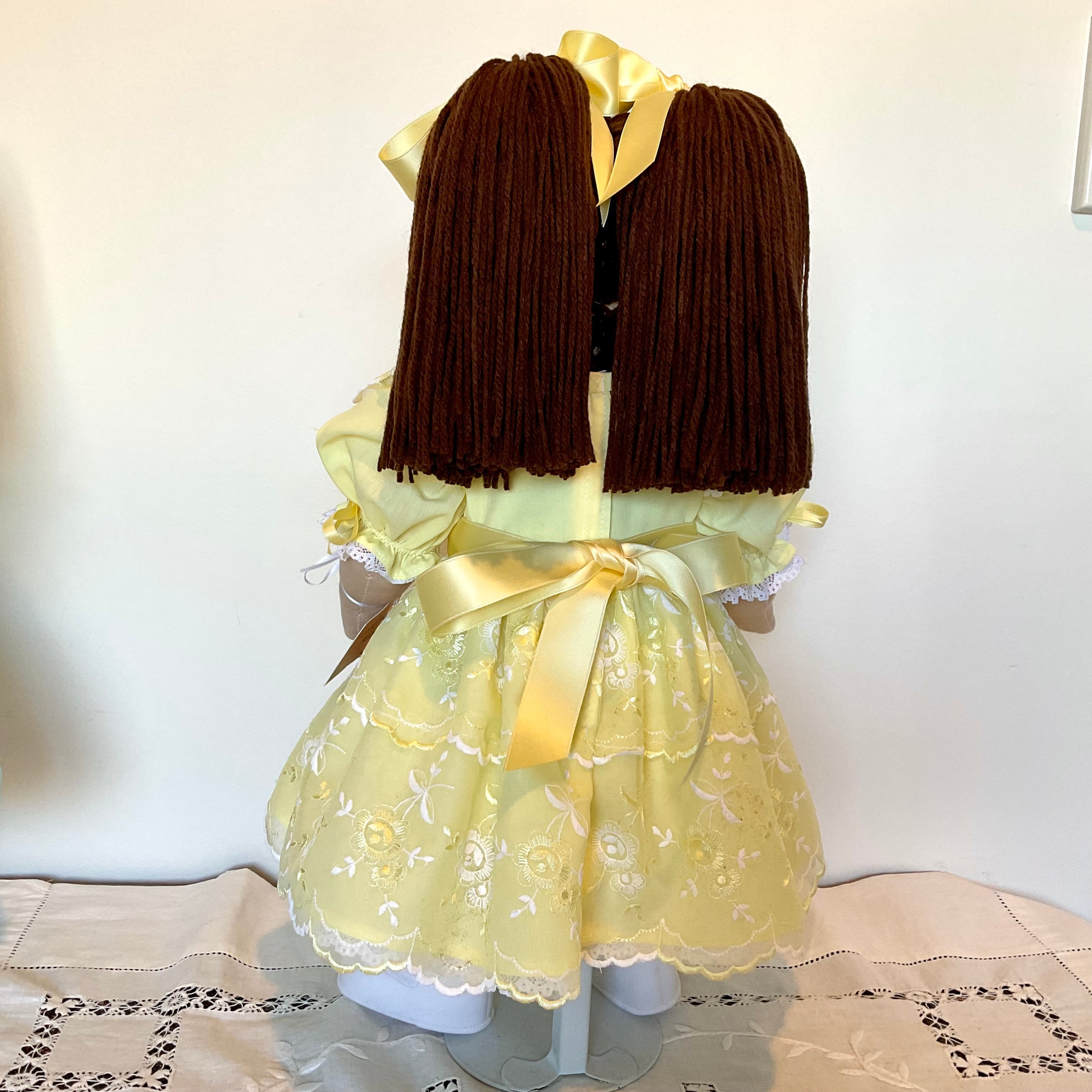 Letitia has brown eyes and dark brown yarn hair fashioned into two ponytails and curls around her face. She is wearing under her dress a white Broderie Anglaise petticoat and matching panties. Her dress is in a beautiful lemon/yellow cotton with a nylon embroidered lace overlay on the skirt and with puffed sleeves and a lace ruffle over the sleeve she has a bow at the neckline and matching ribbons in her hair. Around her waist is a matching sash which ties at the back. She also wears white handmade socks and white Mary Jane shoes. Letitia has attached limbs and is easily dressed and undressed She sits well and is washable, and durable and suitable for all children or Collectors.
