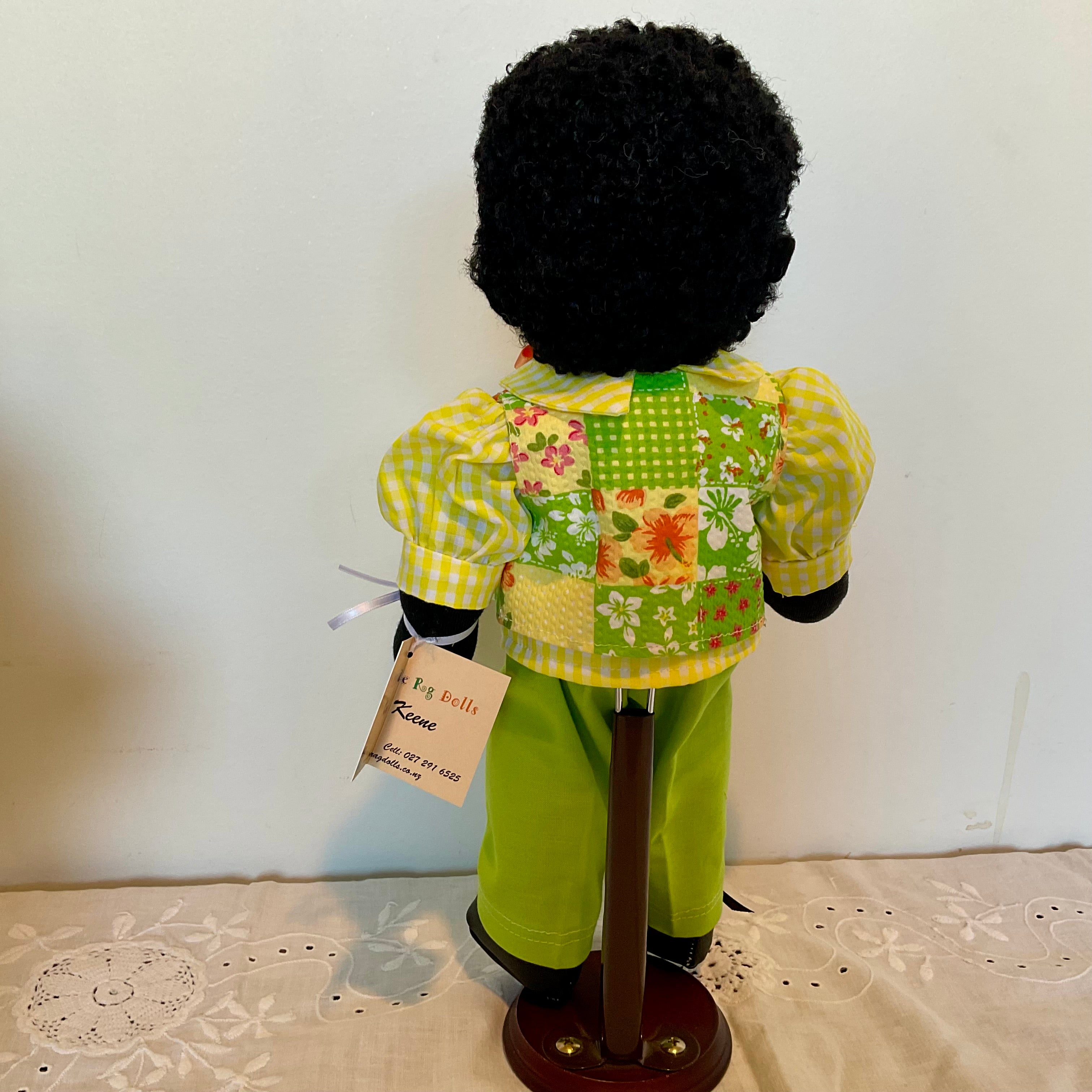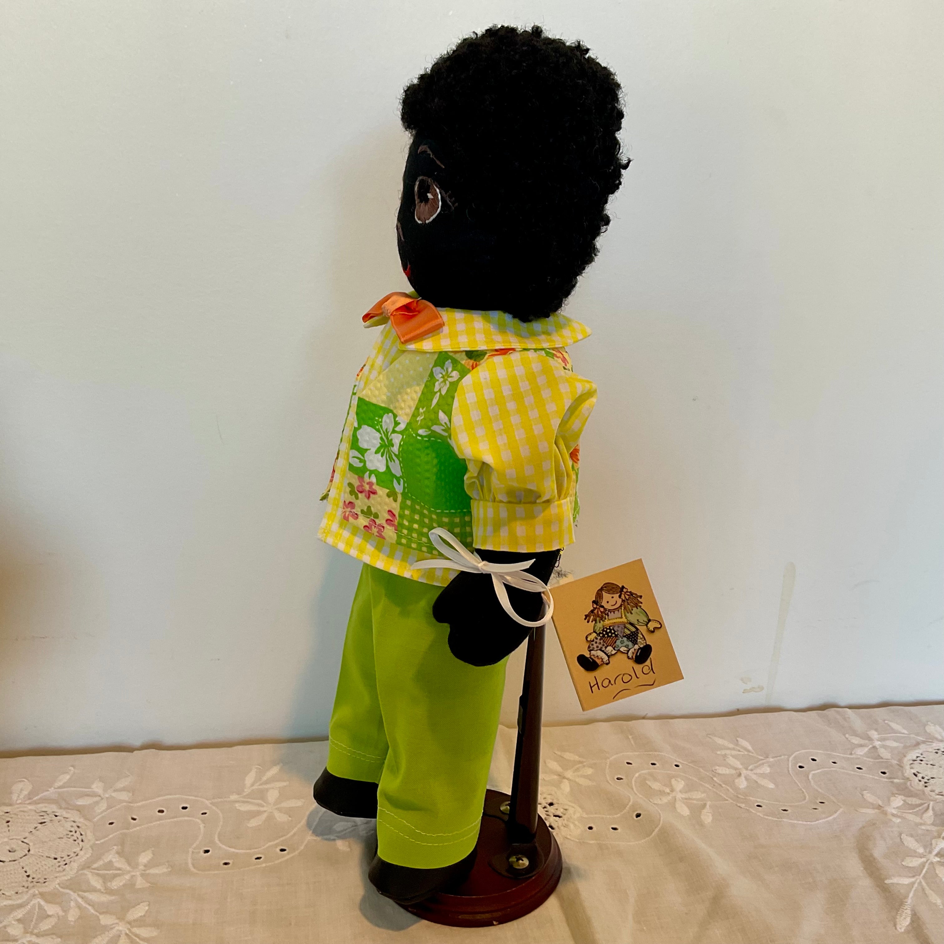 Harold has brown eyes and black Astrakhan fabric hair and is wearing long green pants,a yellow gingham shirt with long sleeves and collar and a bright floral patchwork style fabric waistcoat and a bright tango bow tie. He also wears black handmade shoes. Harold has attached limbs,and is easily dressed and undressed he sits well and is washable and durable and suitable for all children