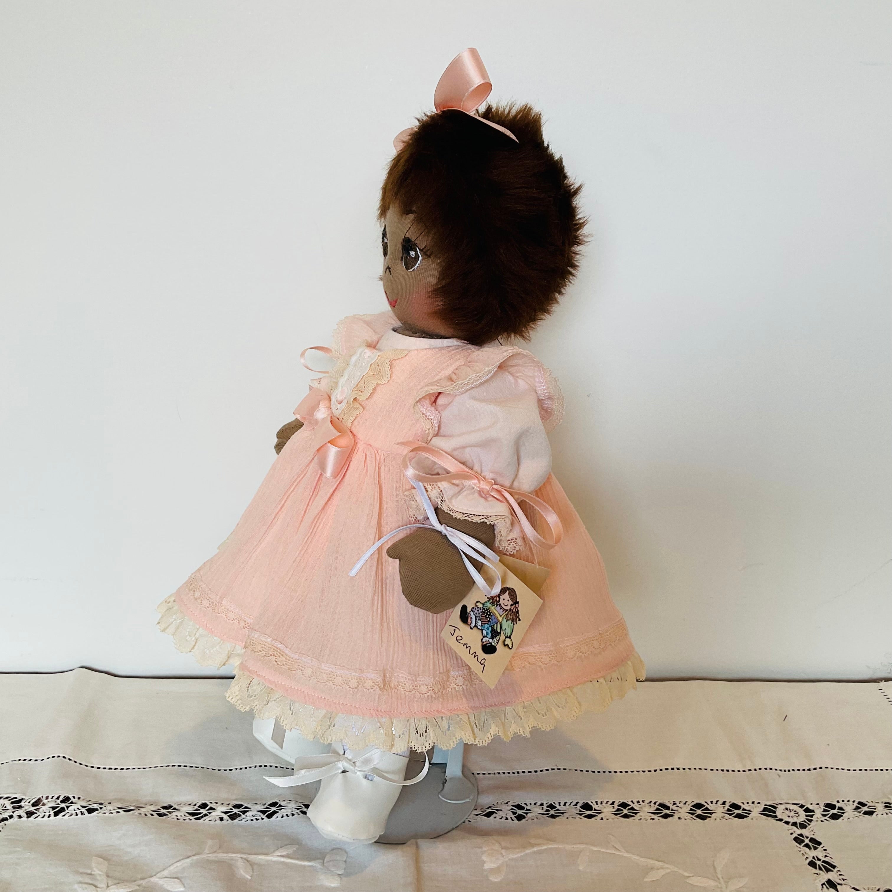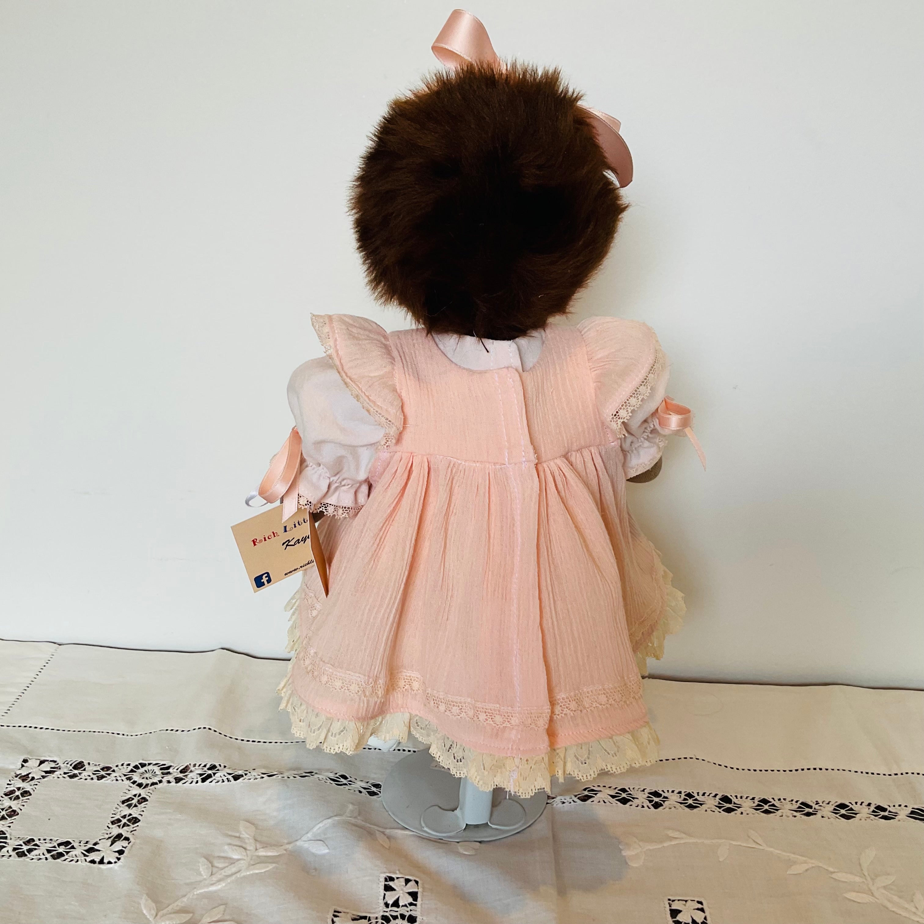 Jemma has brown eyes and dark brown FauxFabric hair and is wearing a beautiful peach coloured underdress with puffed sleeves and matching panties. Her overdress or pinafore in a peach crinkle cotton featuring lace trimmed flutter sleeves ,lace trimmed bodice and a lace trimmed full skirt she has a bow on the bodice and matching ribbon in her hair. She also wears white handmade socks and shoes. Jemma has attached limbs and is easily dressed and undressed. She sits well and is washable and durable and suitable for all children.