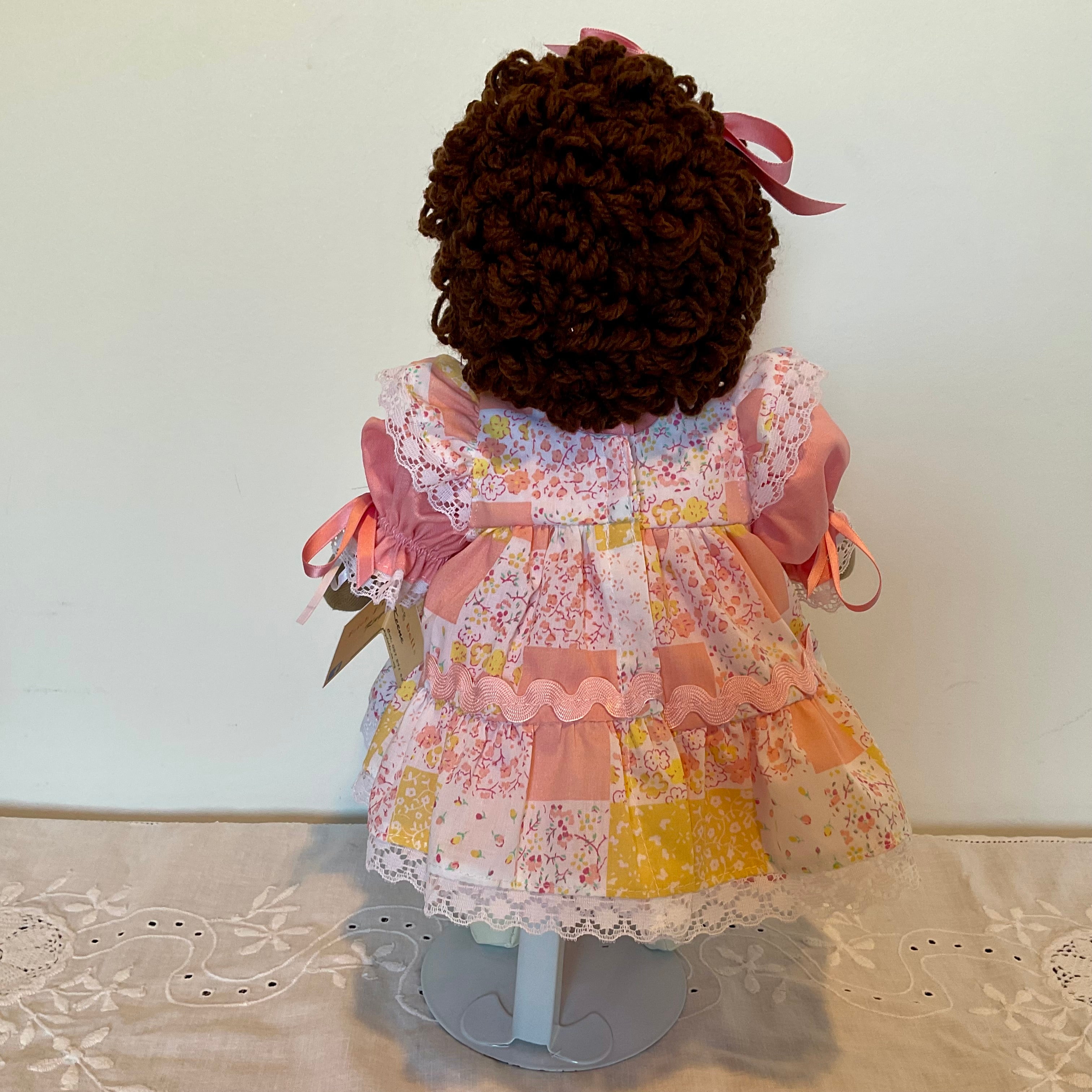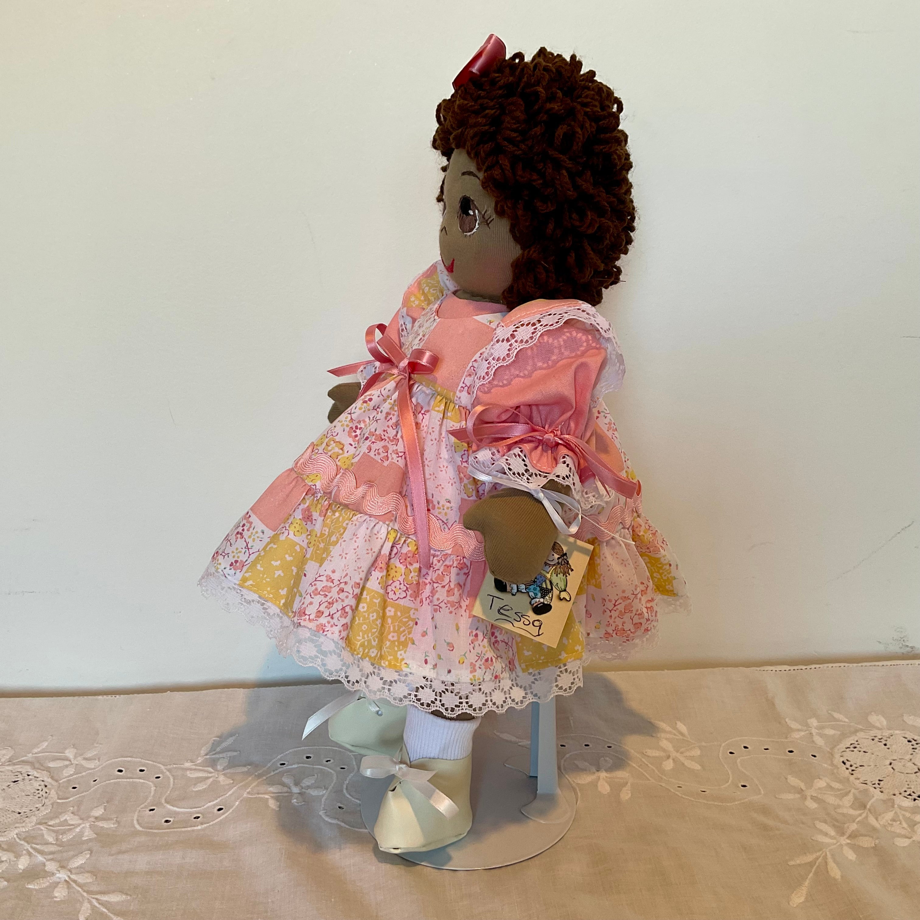 Tessa has brown eyes and dark brown yarn hair fashioned into curls all over her head. She is wearing a beautiful peach/apricot underdress with puffed sleeves and panties. Her overdress or pinafore is in a delightful complimenting patchwork patterned fabric with lace trimmed flutter sleeves a lace trimmed flounced hemline and decorated with RicRac braid and a bow on the bodice.   She has a matching ribbon in her hair. She has white handmade socks and shoes. Tessa has attached limbs and is easily dressed and undressed. She sits well and is washable and durable and suitable for all children.