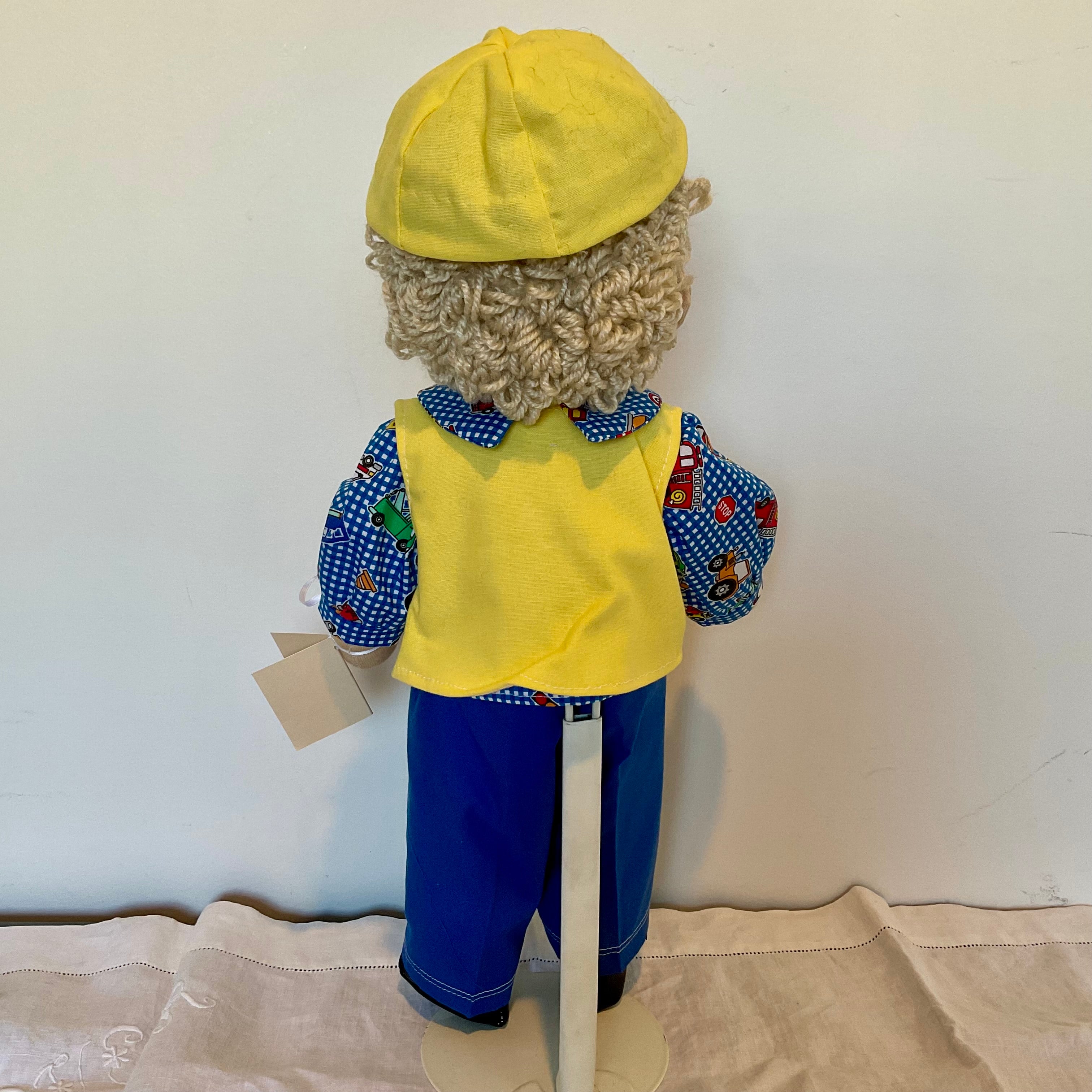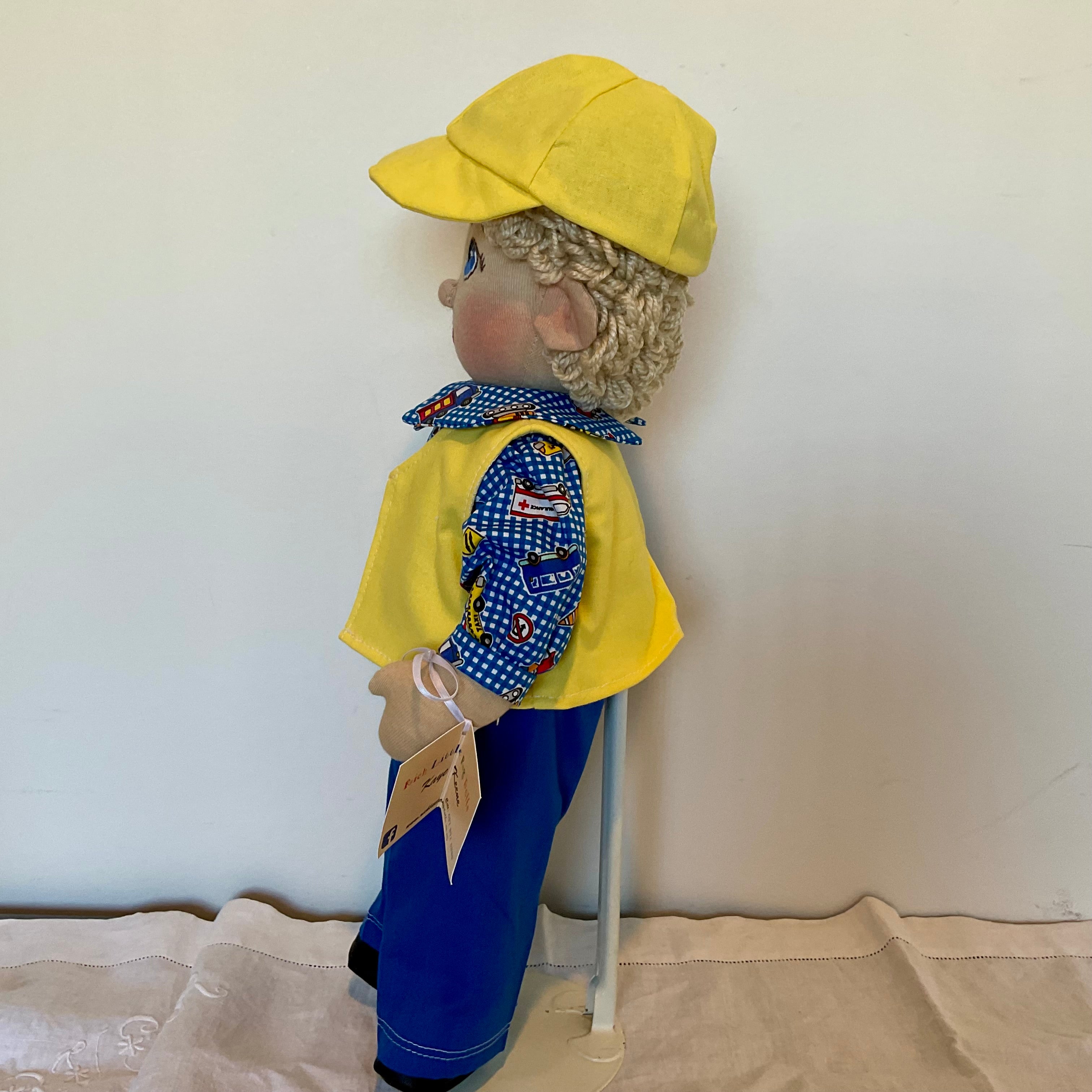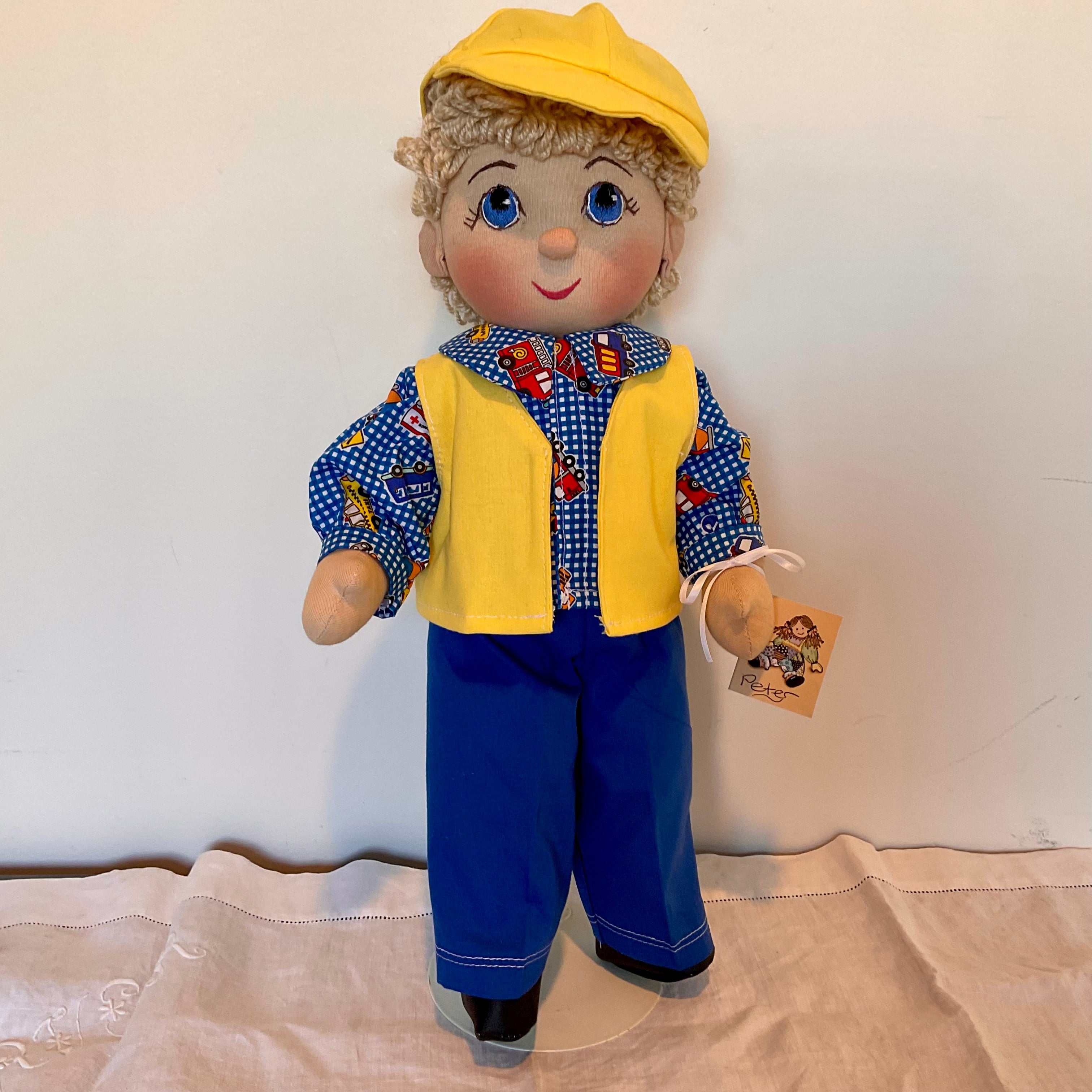 Peter has blue eyes,and blonde yarn hair fashioned into curls, and is wearing a blue checked shirt featuring trucks and boy things it has a collar and cuffs and is worn with Blue long trousers ,undershorts and a yellow jacket and cap. He also wears handmade white socks and black shoes. Peter has attached limbs is easily dressed and undressed. He sits well and is washable and durable and suitable for all children.