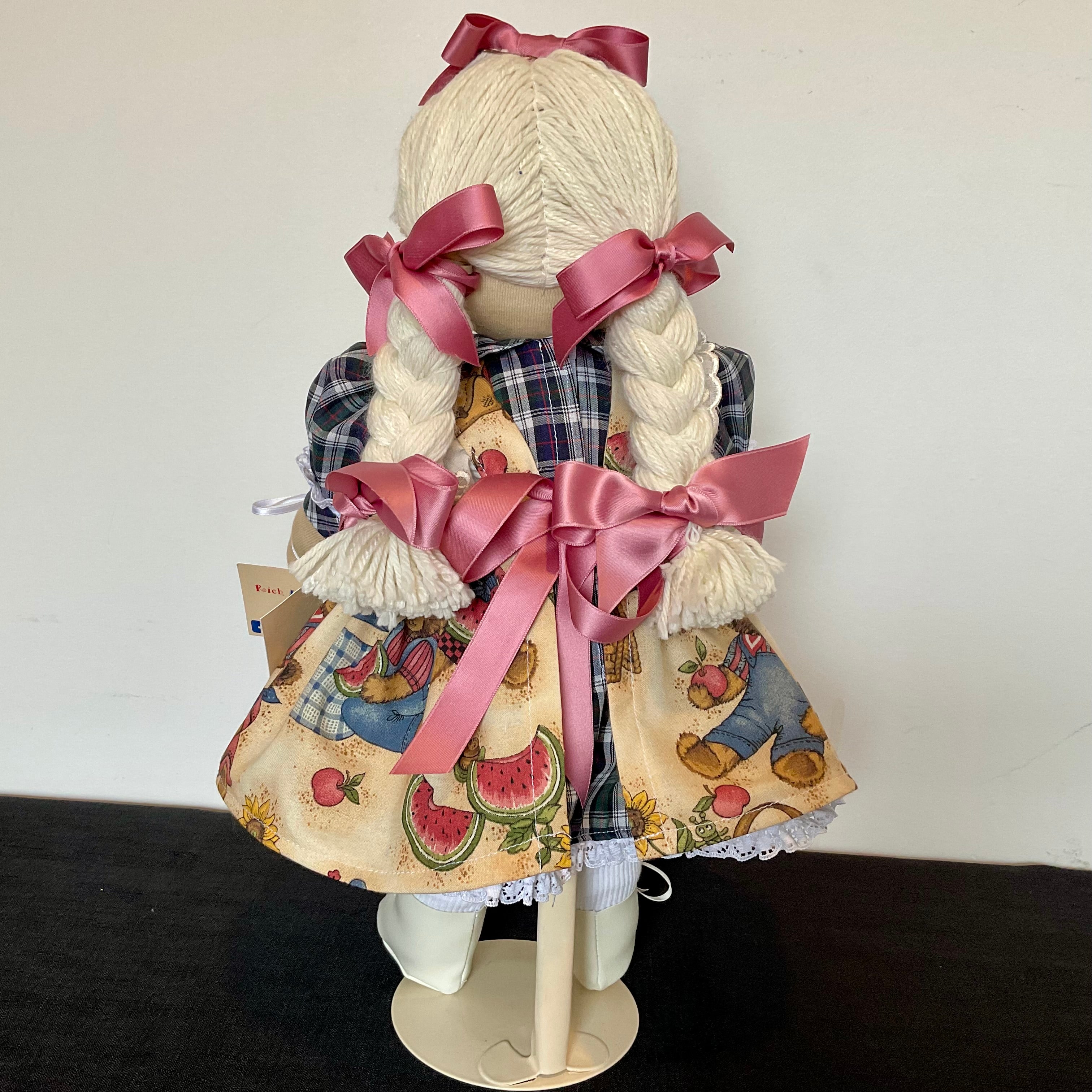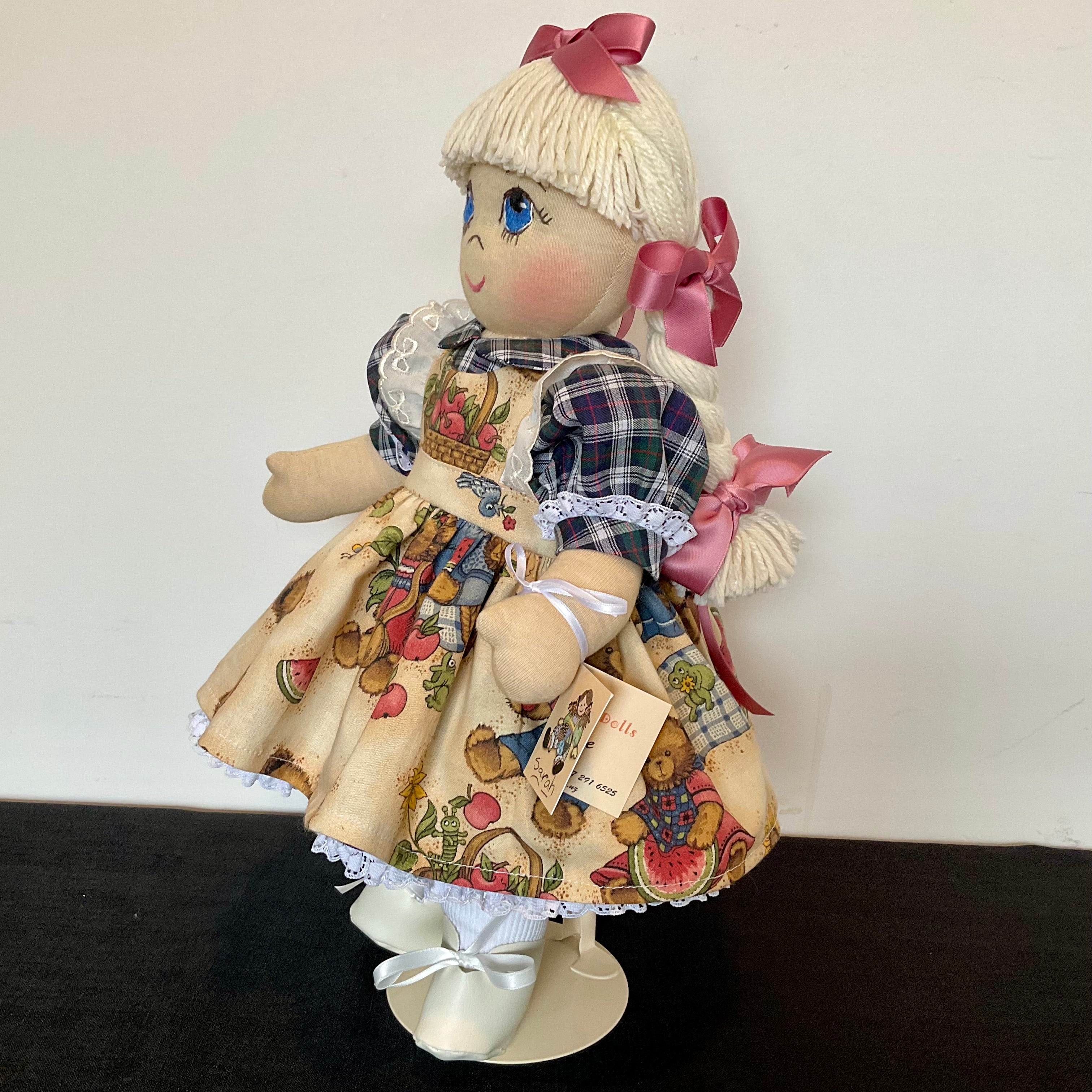 Sarah has blue eyes and blonde yarn hair fashioned into plaits  tied with ribbons ,and a fringe and is wearing a beautiful tartan underdress with lace trimmed  puffed sleeves and a Peter pan collar with white panties. Her overdress or apron is in a delightful vintage fabric featuring Teddy Bears and Autumn fruits .and other wood,and animals  She also wears white handmade socks and shoes.  Sarah has attached limbs and is easily dressed and undressed. She sits well ,is washable and durable and suitable for all children.