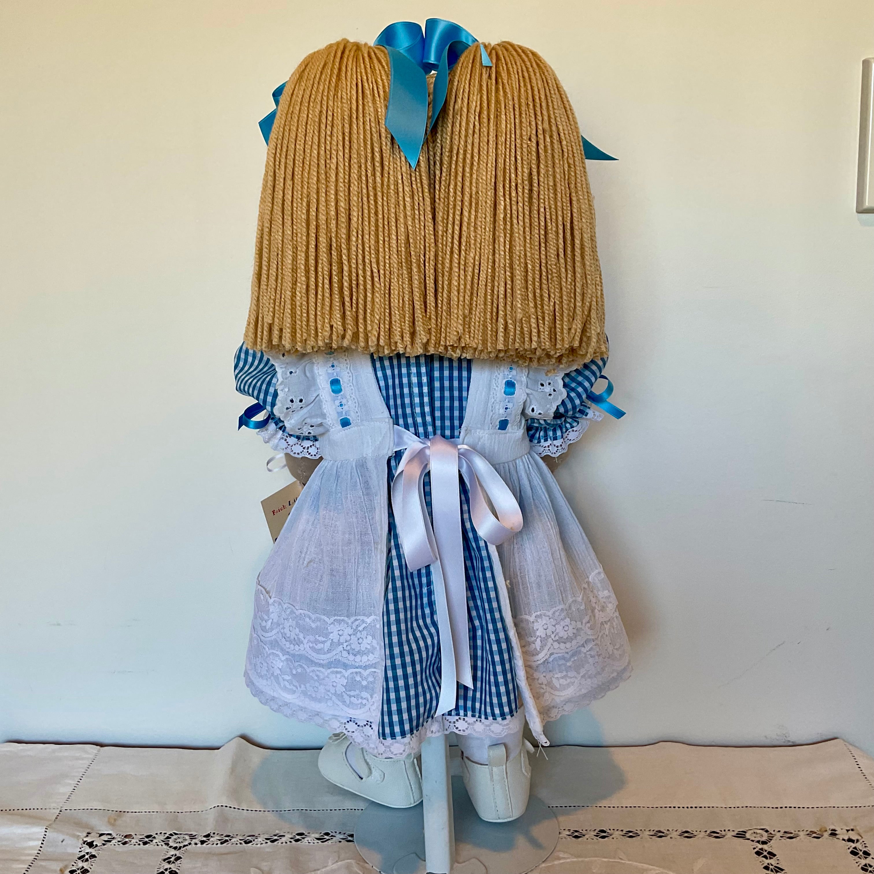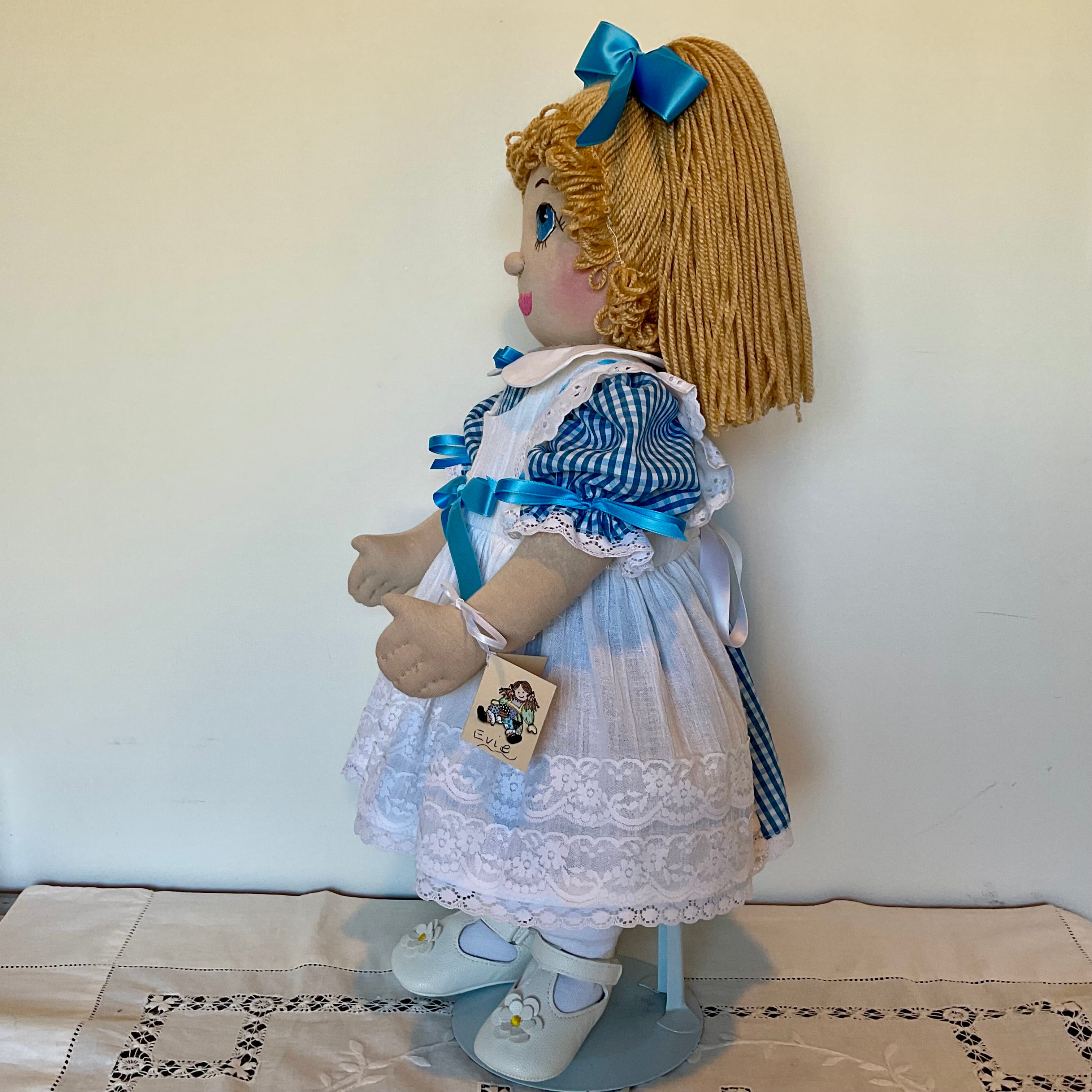 Evie has blue eyes and golden blonde yarn hair,fashioned into two high ponytails and with curls around her face. She is wearing a lovely bright blue gingham underdress with puffed sleeves and a white Peter Pan collar and matching panties Her overdress is in a white vintage cheesecloth fabric ,the skirt is attached to the skirt ,which has beautiful wide lace above the hemline and the bodice has beribboned ruffled lace over the shoulders,with a bow on the waistband She has matching ribbons in her hair and also wears white handmade socks and purchased baby shoes. Evie has attached limbs and is easily dressed and undressed ,she sits well and is washable and durable and suitable for all children.