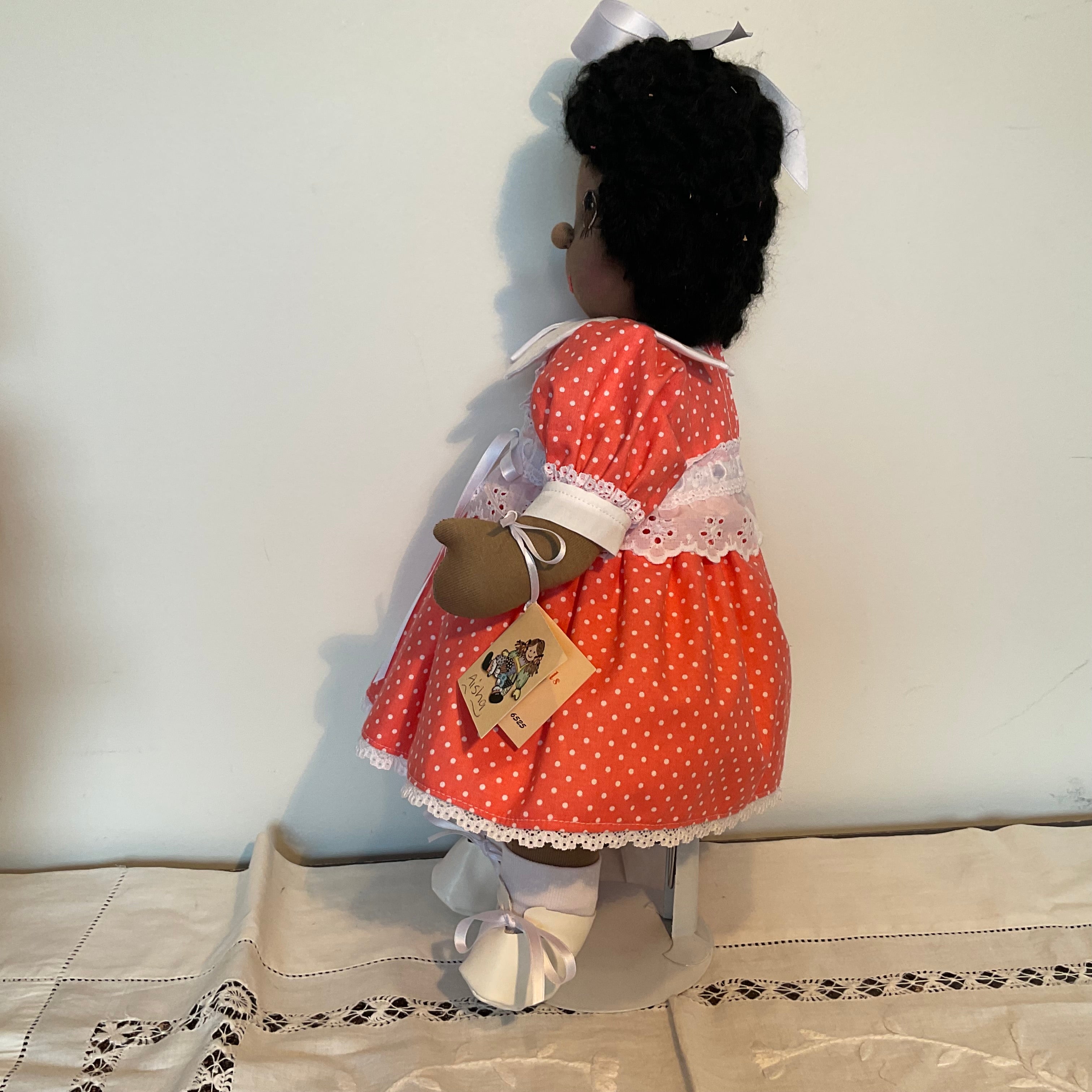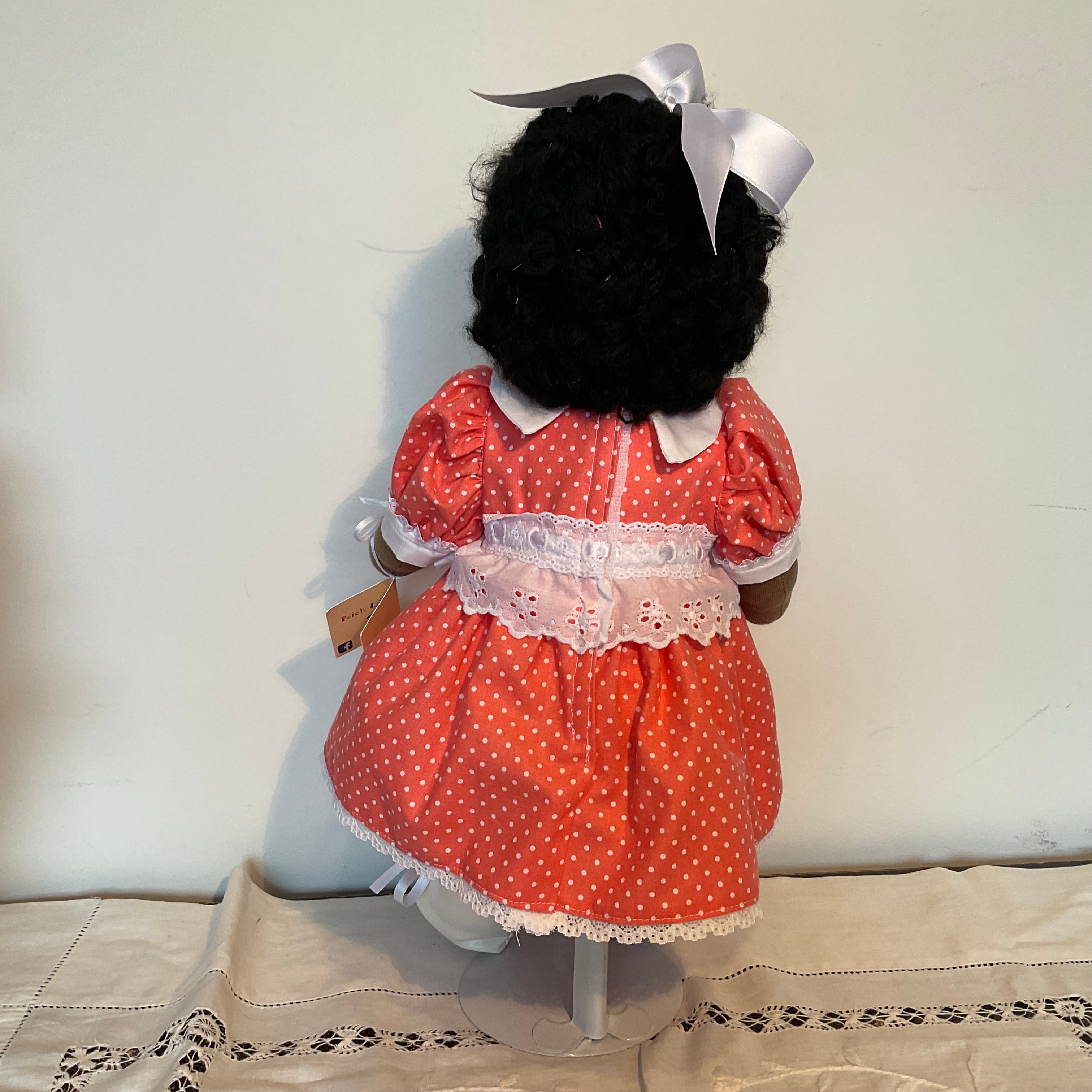 Aisha has brown eyes and black Faux Mohair yarn hair in curls and is wearing a beautiful bright coral and white tiny spot dress with puffed sleeves.It has a contrasting square collar and matching cuffs,a lace trimmed bodice and a Broderie lace trim and bow at the waistline. It also features a lace trimmed hemline She has a full petticoat and panties under her dress. She has matching ribbons in her hair She also wears white Handmade socks and shoes.  Aisha has attached limbs and is easily dressed and undressed. She sits well and is washable and durable and suitable for all children