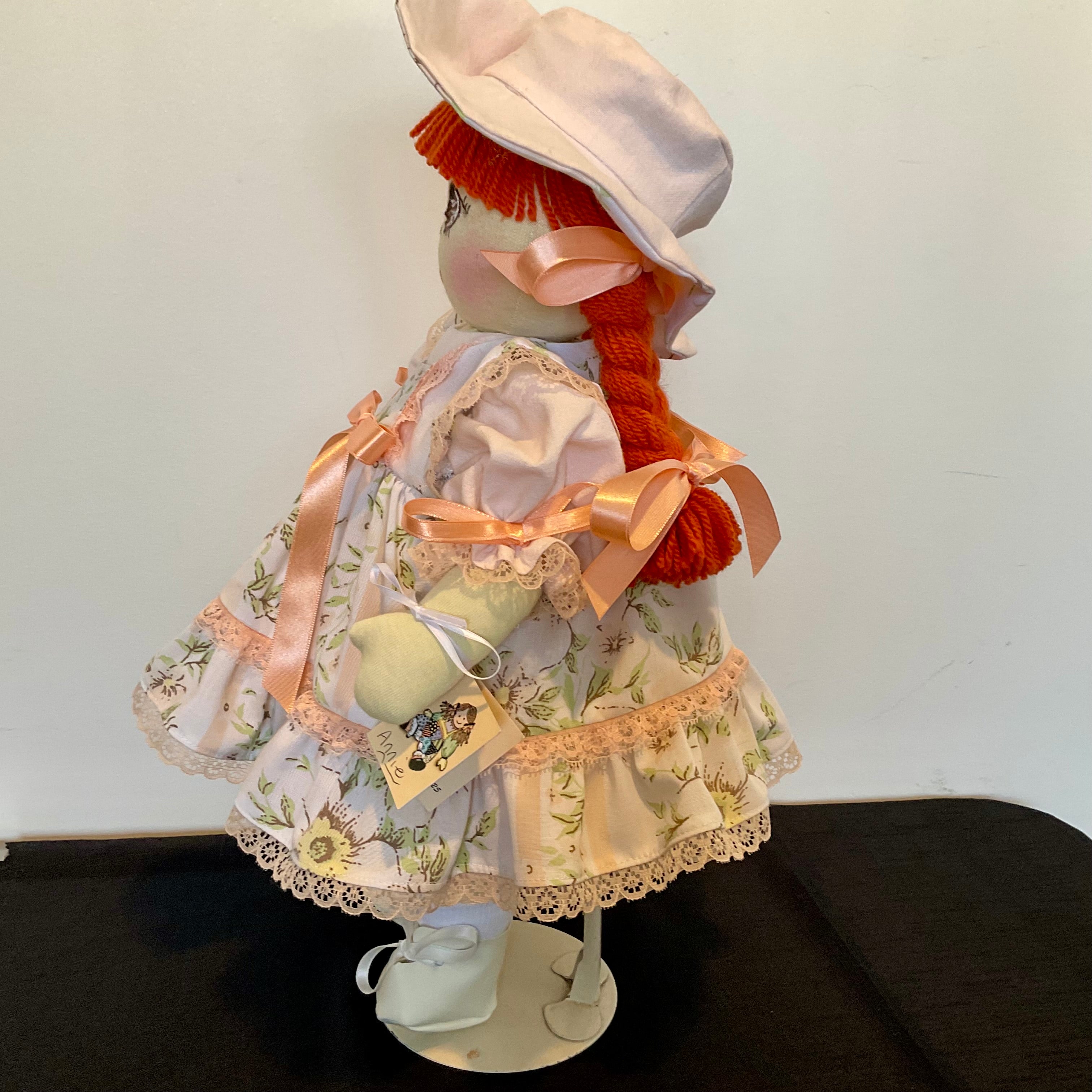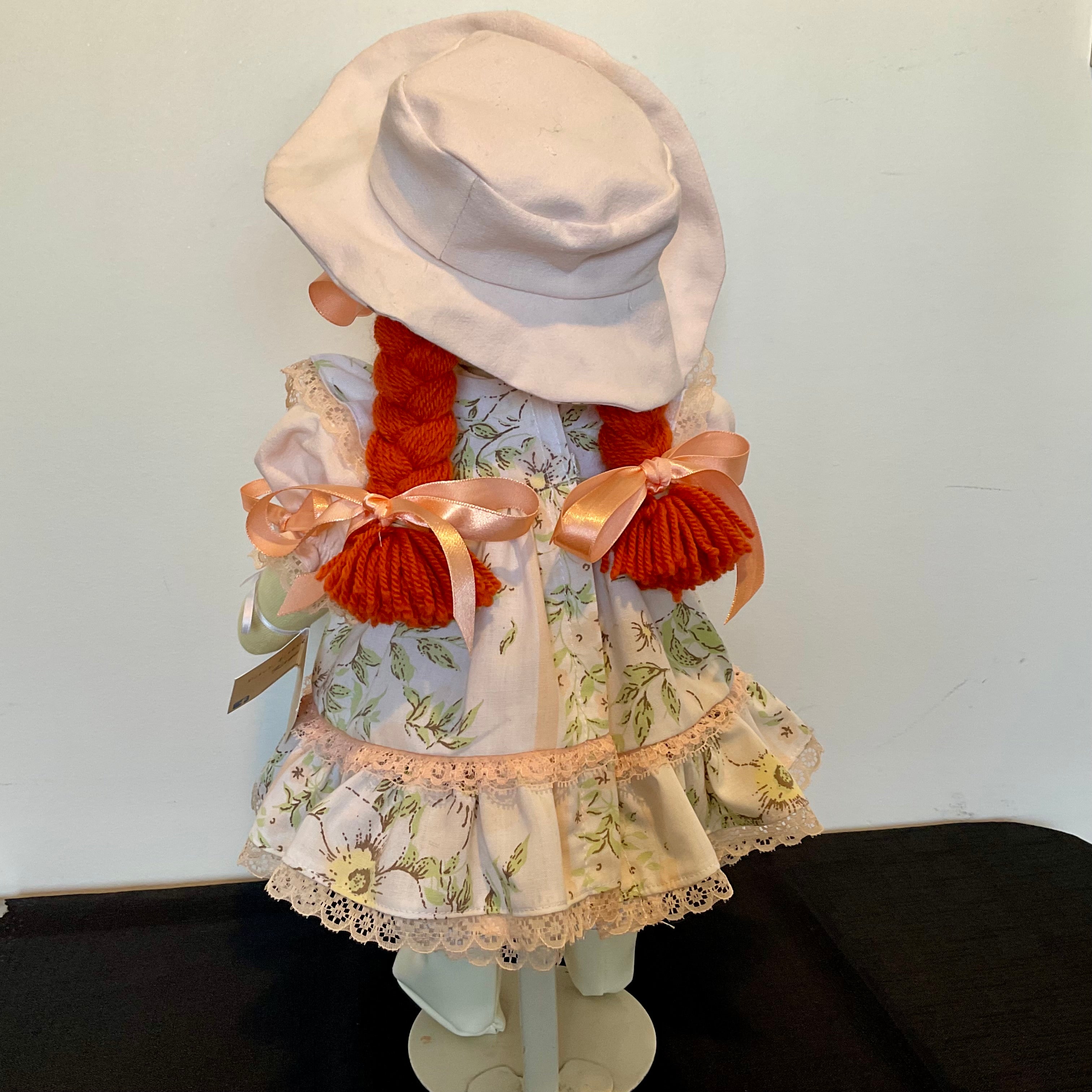 Annie has brown eyes and bright auburn  yarn hair fashioned into plaits and a fringe and is wearing a soft apricot underdress with puffed sleeves and matching panties. Her overdress or pinafore is in a complimenting apricot floral pattern fabric and features lace trimmed flutter sleeves and a  lace trimmed ruffled hemline   She has a bow on the bodice ,a matching hat and matching ribbons in her hair. She also wears white handmade socks and shoes  Annie has attached limbs and is easily dressed and undressed ,she sits well and is washable and durable and suitable for all children