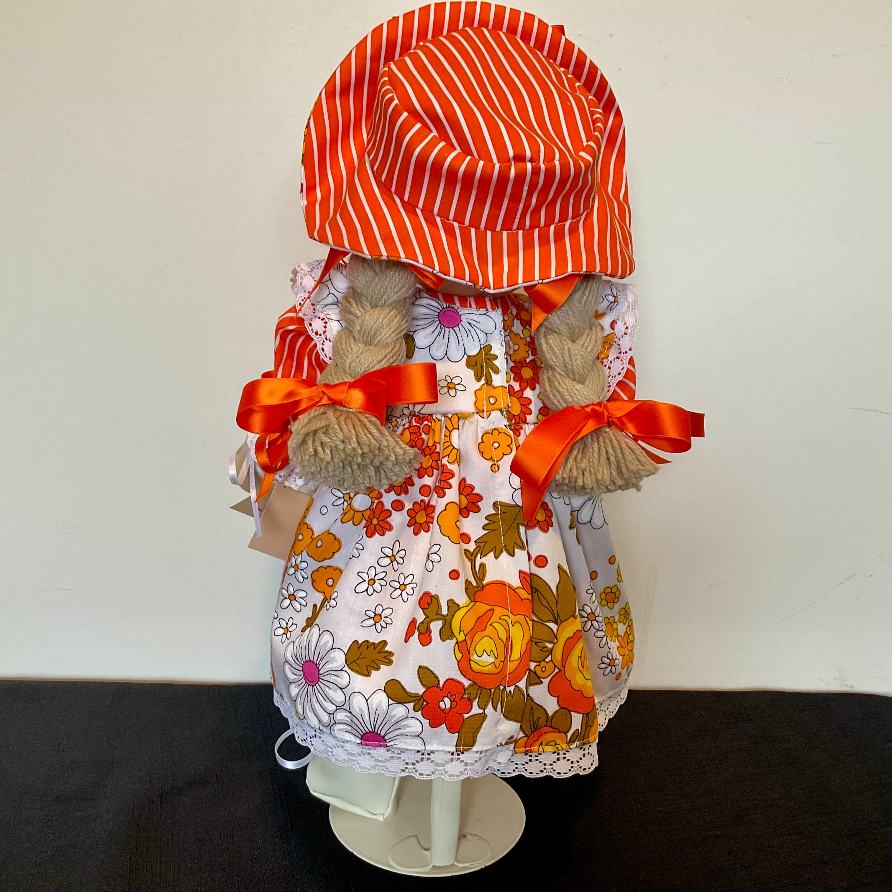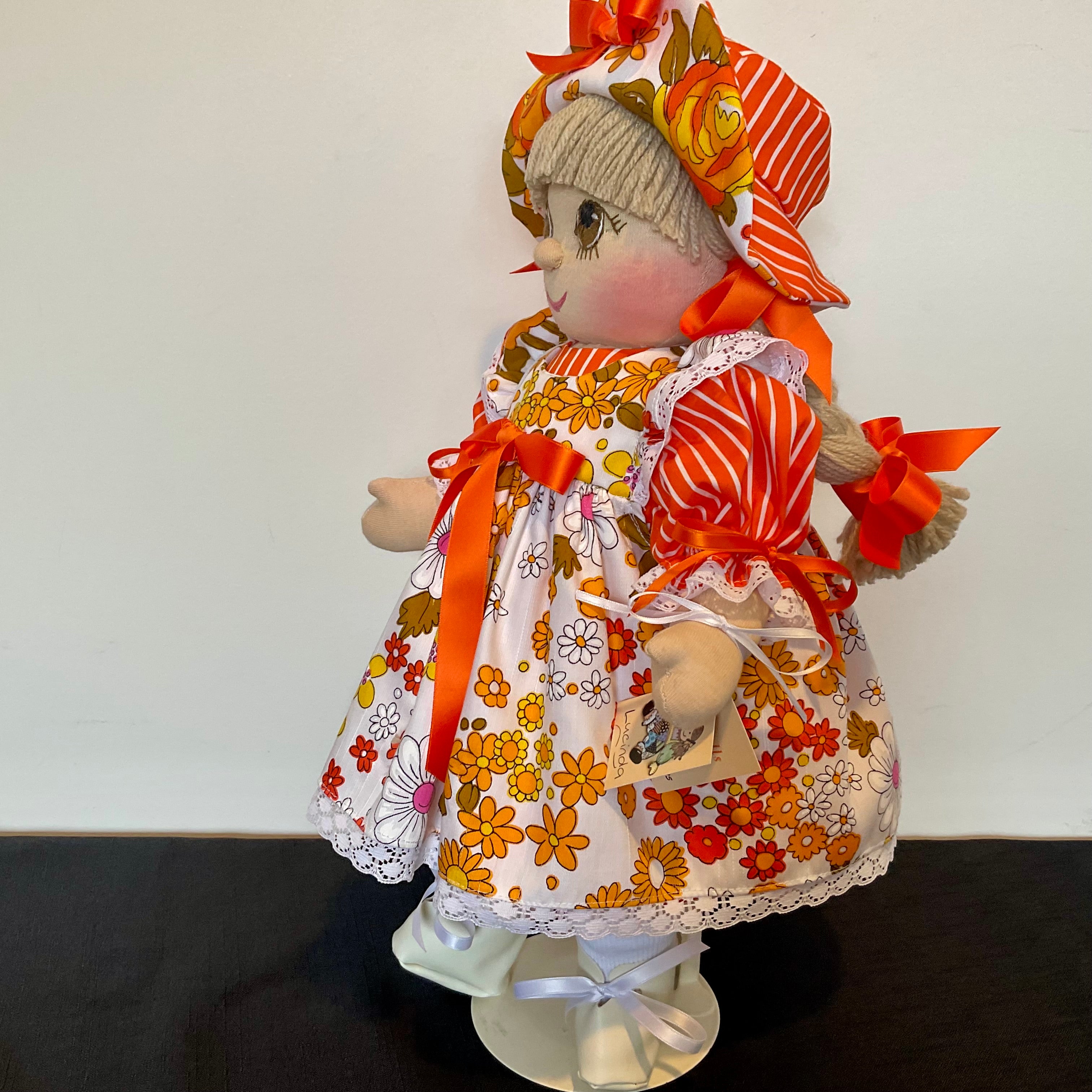 Lucinda has brown eyes and dark blonde yarn hair fashioned into plaits and a fringe. She is wearing a bright orange and white striped underdress with puffed sleeves and matching panties. Her overdress or pinafore is in a bright floral fabric with lace trimmed flutter sleeves,a bow on the bodice and a lace trimmed hemline she has a matching hat and ribbons in her hair. She also wears white handmade socks and shoes. Lucinda has attached limbs and is easily dressed and undressed. She sits well is washable and durable ,and is suitable for all children