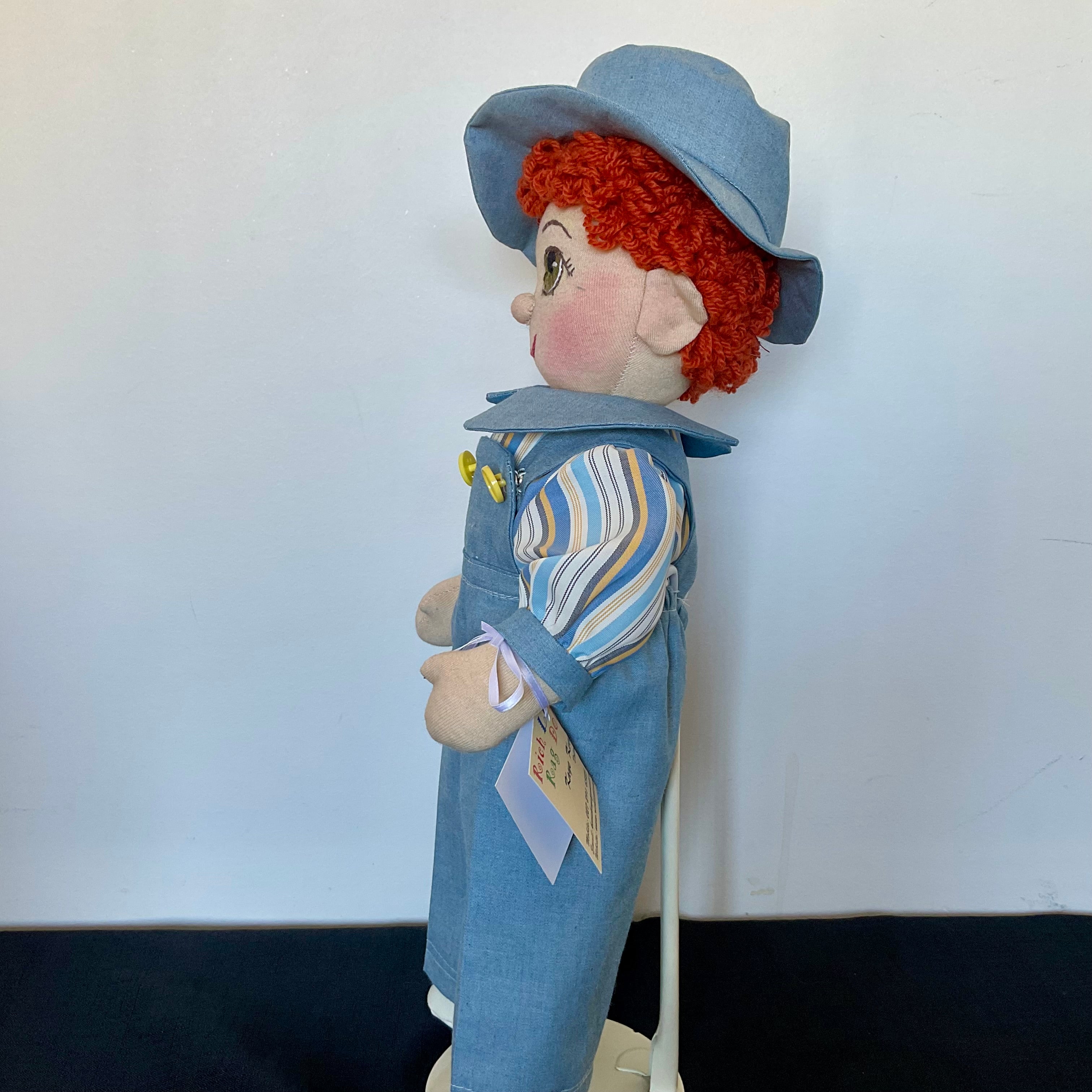 Benny has Hazel  eyes and bright auburn yarn hair fashioned into  all over curls on his head ,and is wearing blue denim overalls with a bib front ,elastic waistband and features two novelty buttons on the bib,and fastens with shoulder straps. He is also wearing a cute silky striped fabric shirt with contrasting collar and cuffs. He wears satin boxers under. He has a matching hat and also wear white handmade socks and shoes.  Benny has attached limbs and is easily dressed and undressed. He sits well and is washable and durable,and suitable for all children.