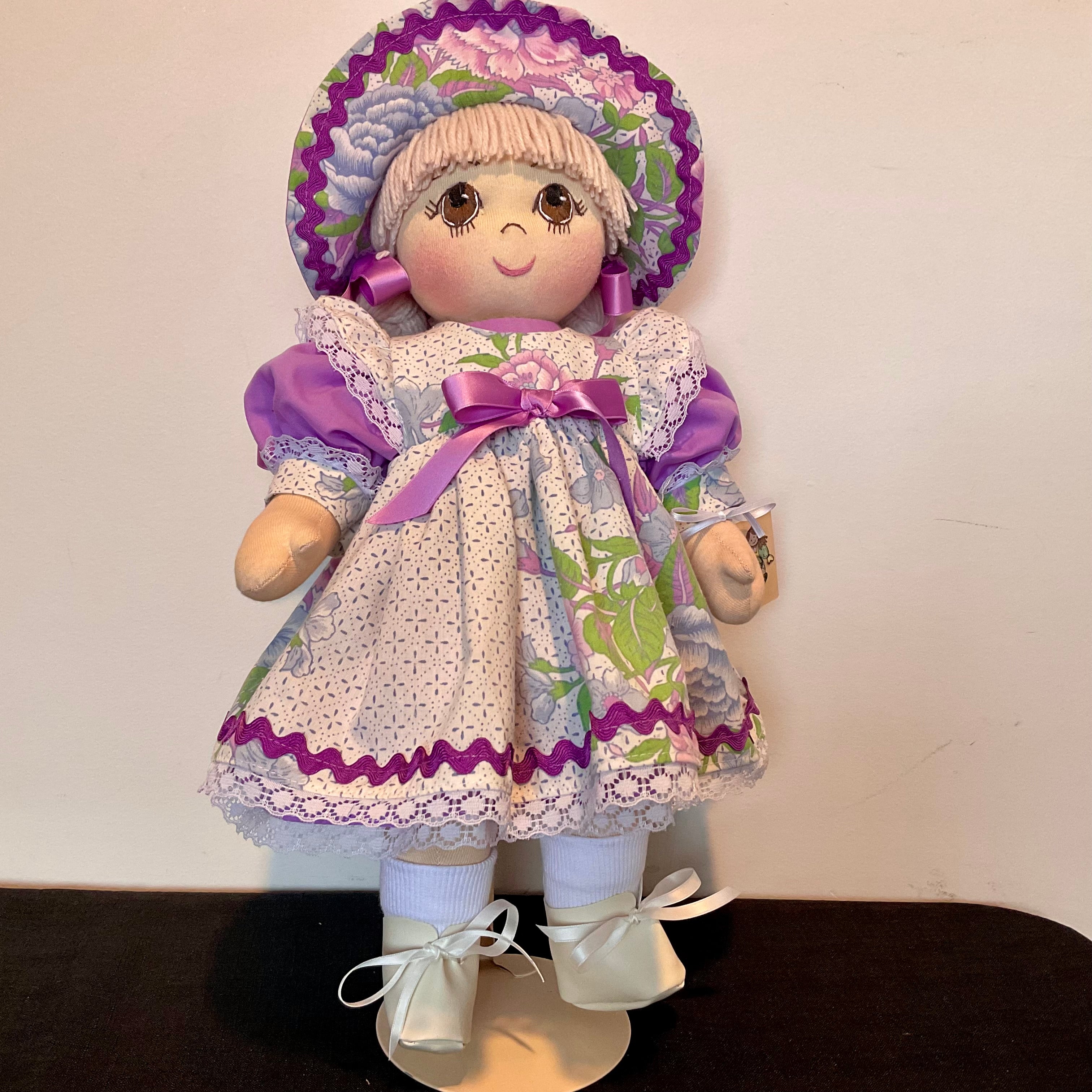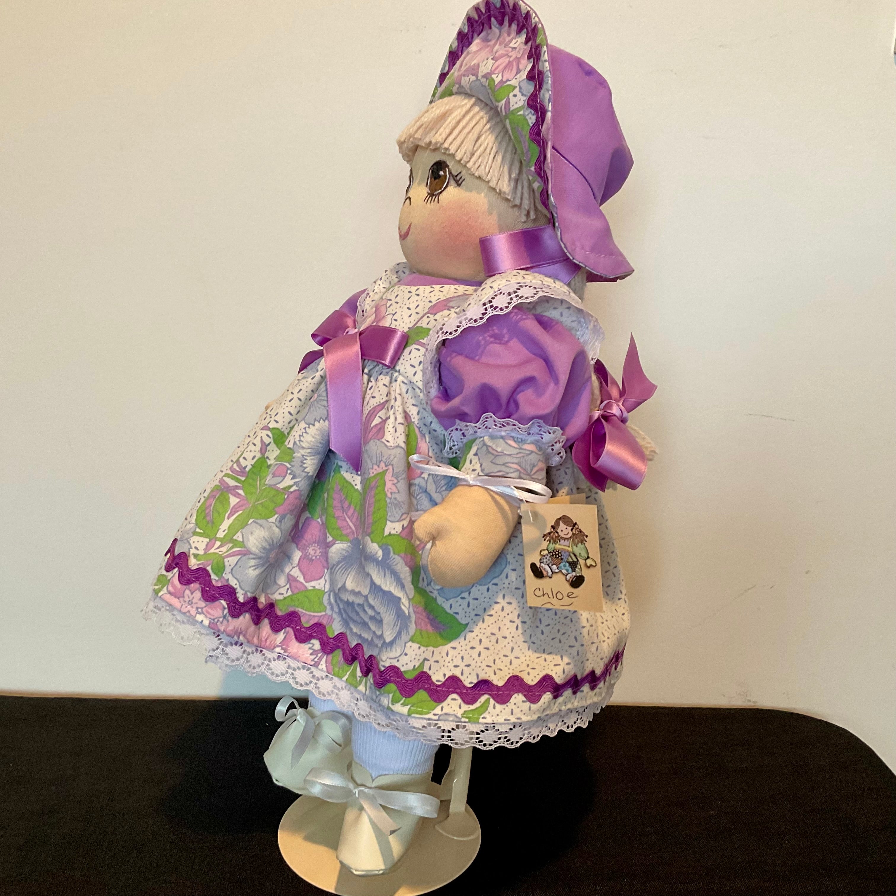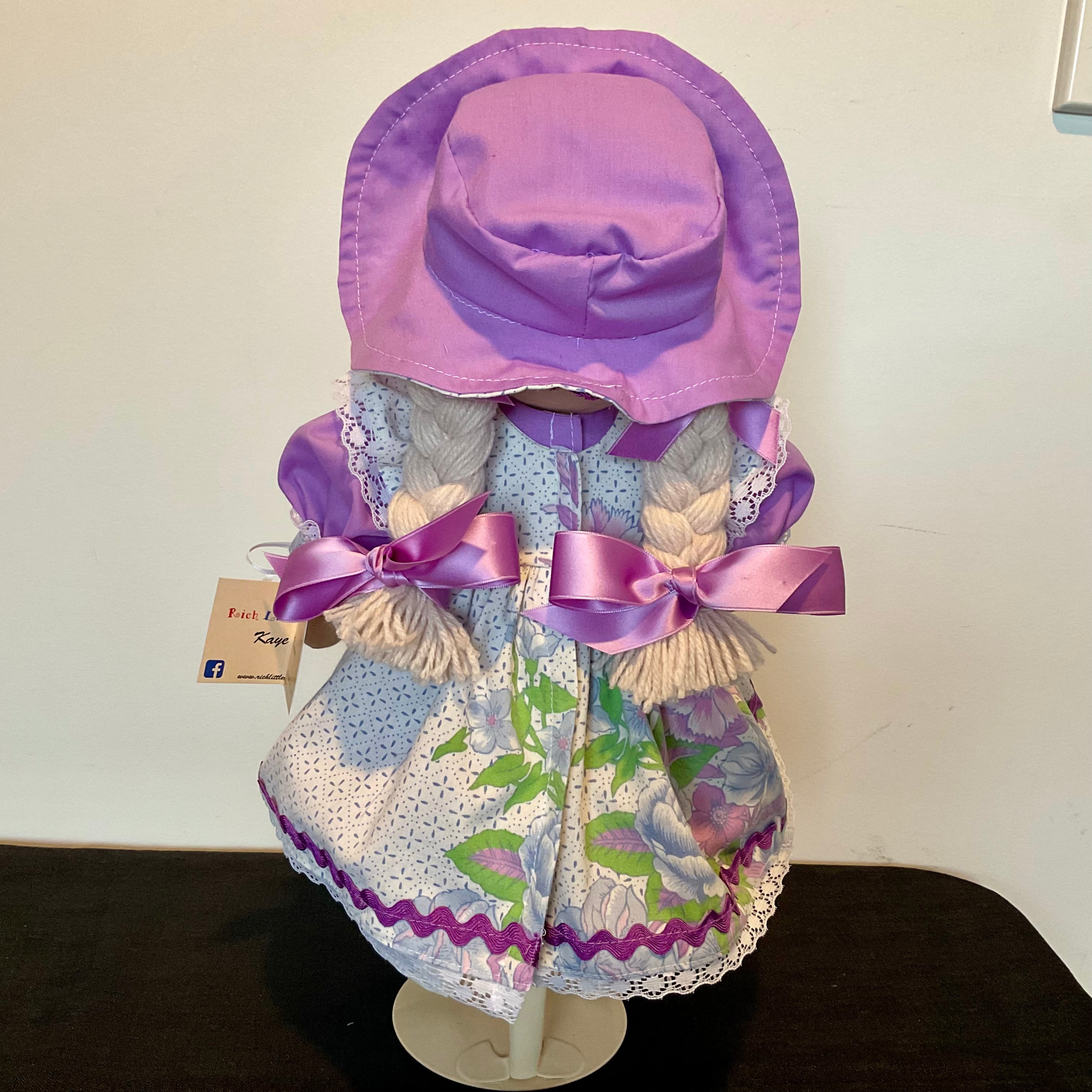 Chloe has brown eyes and blonde yarn hair fashioned into two plaits and a fringe and is wearing a gorgeous lilac underdress with puffed sleeves and matching panties. Her overdress is in a pretty patterned floral fabric featuring lace trimmed flutter sleeves and added RicRacTrim she has a bow on the bodice and also wears a matching RicRacTrimmed hat. She has matching ribbons in her hair. She also wears white handmade socks and shoes. Chloe has attached limbs and is easily dressed and undressed. She sits well and is washable and durable and suitable for all children.