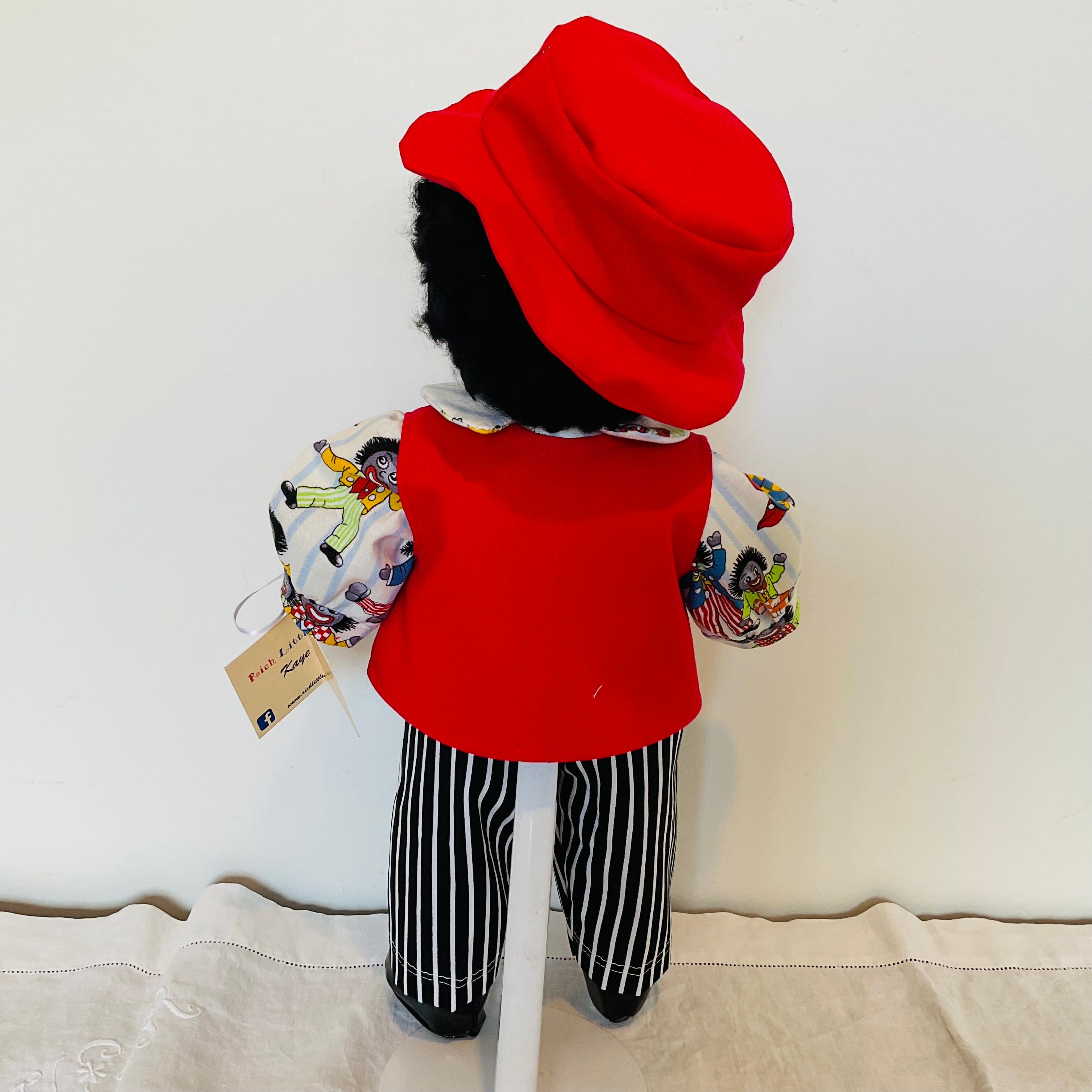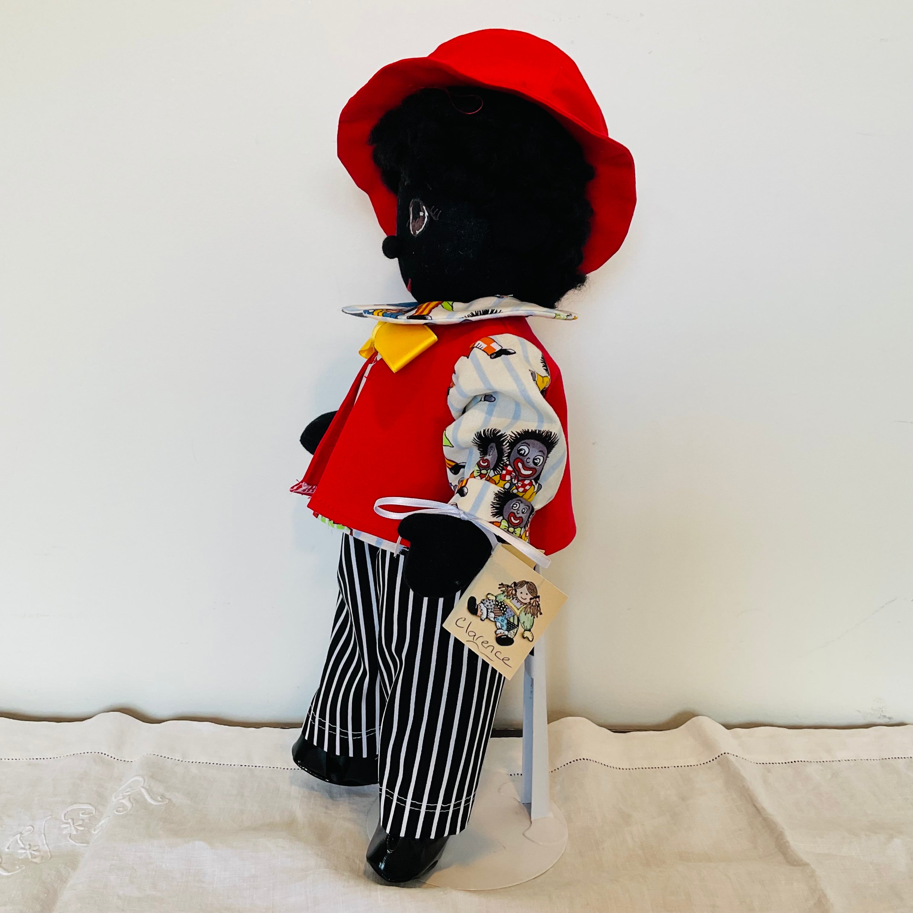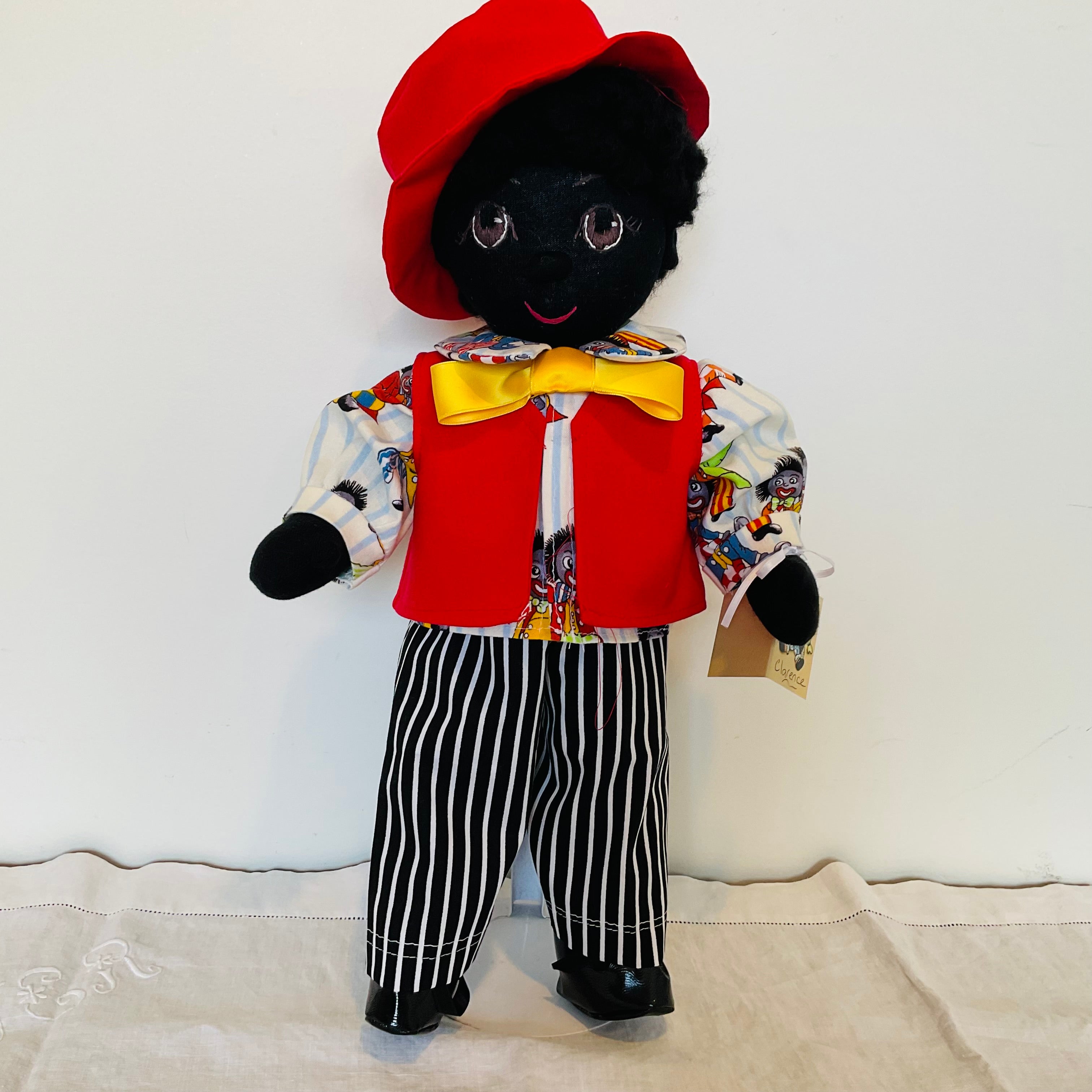 Clarence has brown eyes,and black yarn curls and is wearing cotton undershorts, black an white striped long pants a novelty golly patterned shirt featuring a collar and cuffs and a red sleeveless jacket he has a matching hat and a bright yellow bow tie. He also wears black shiny shoes. Clarence has attached limbs and is easily dressed and undressed. He sits well and is washable and durable and suitable for all children and Adult