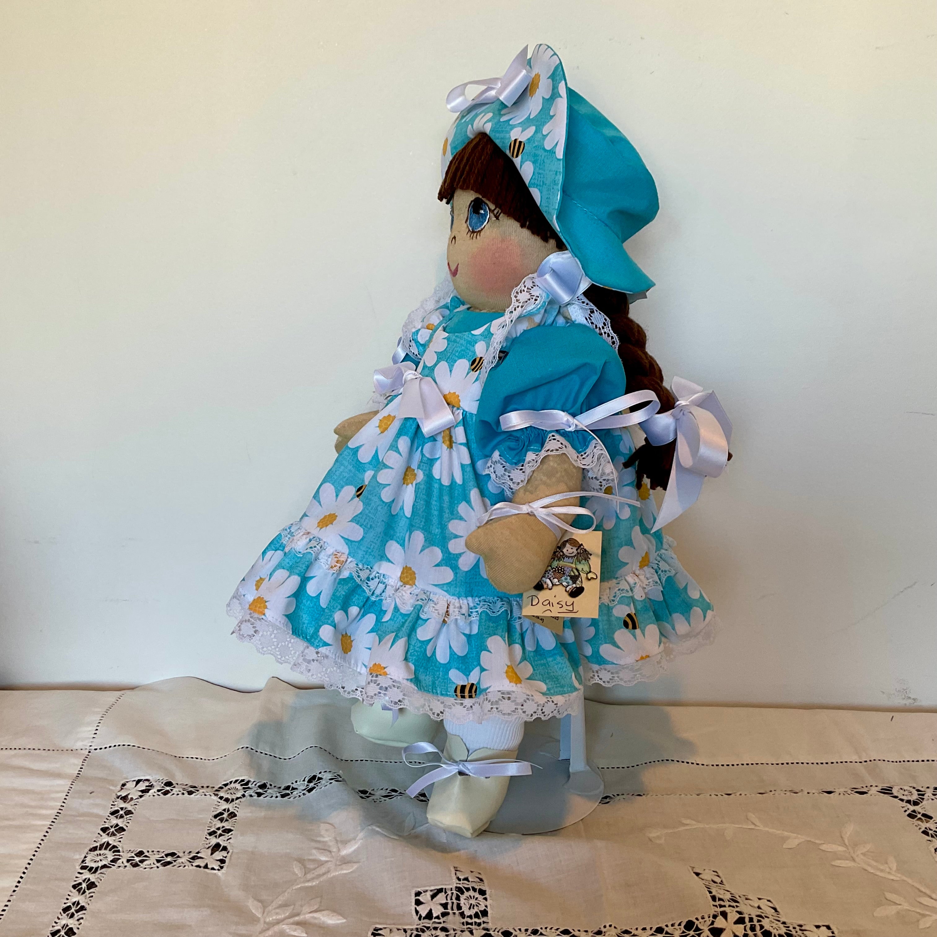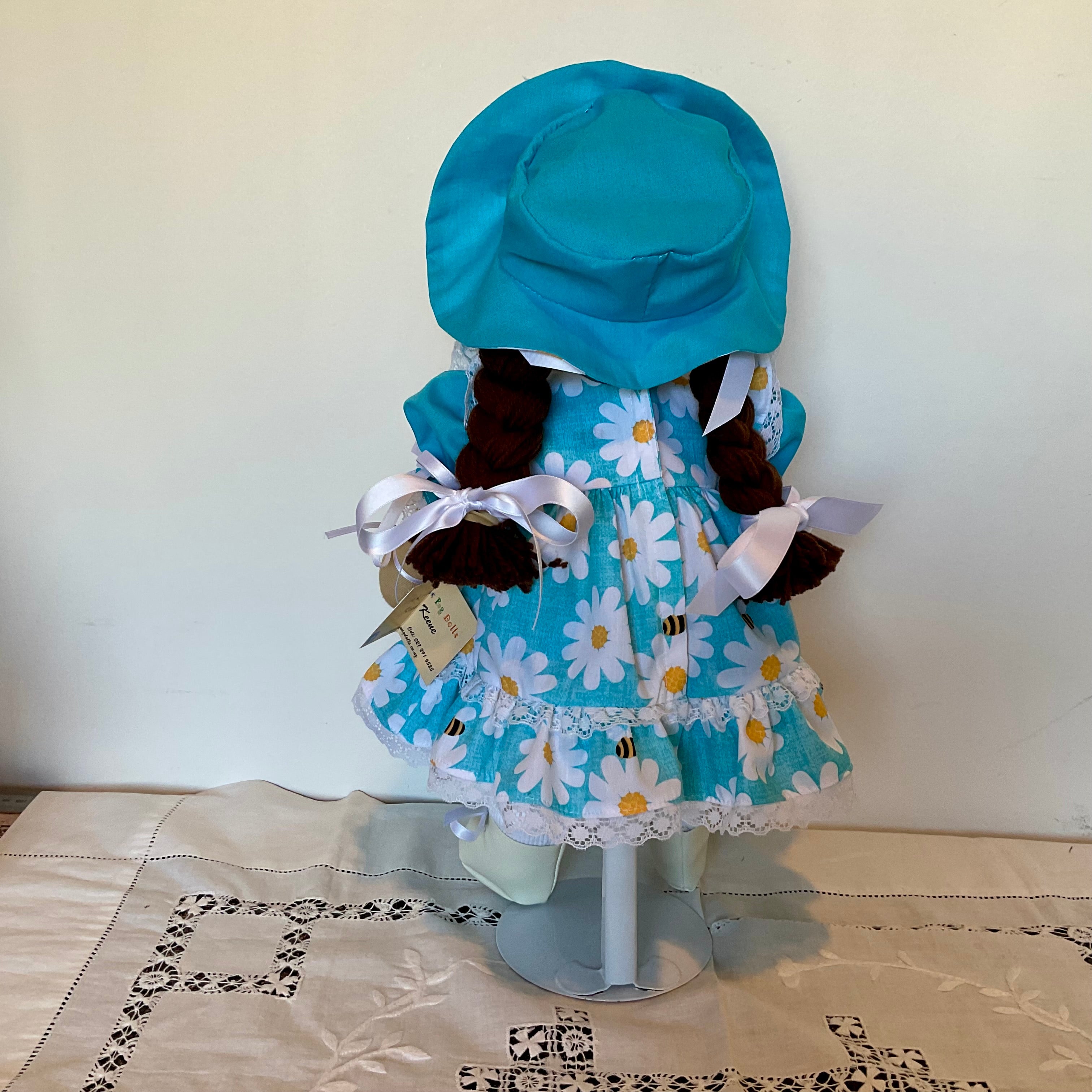 Daisy has blue  eyes and dark brown yarn hair in plaits and a fringe and is wearing a beautiful bright blue underdress with puffed sleeves and matching panties. Her overdress or pinafore is in a daisy patterned complimenting fabric with lace trimmed flutter sleeves and a lace trimmed ruffled hemline. She has a bow on her bodice and matching ribbons in  her hair. She has a matching hat. She also wears white handmade socks and shoes. Daisy has attached limbs and is easily dressed and undressed she sits well and is washable and durable and suitable for all children or collectors.