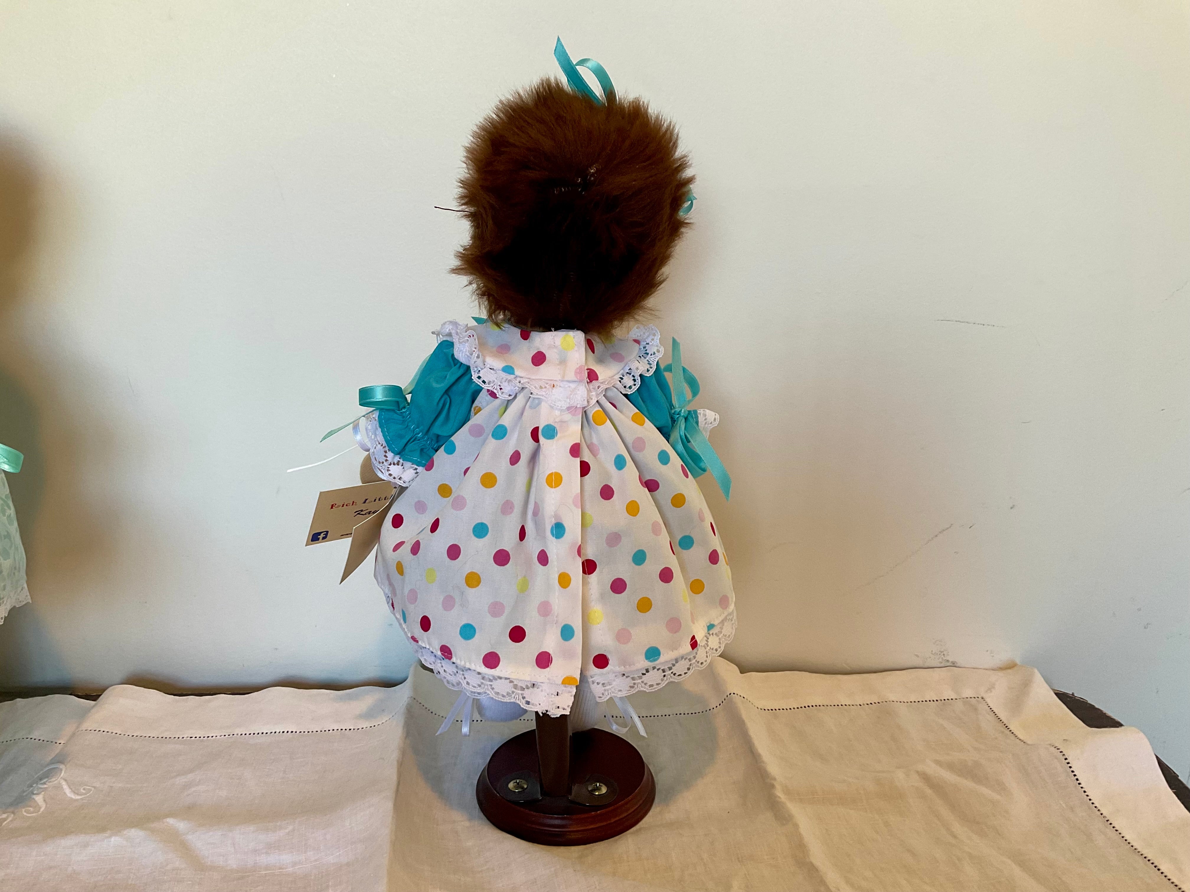 Dotty has blue eyes and brown FauxFur hair and wears a turquoise /blue underdress with puffed sleeves and round yoke,and matching panties. Her overdress is in a pretty multi spottted fabric with a lace trimmed round yoke and features a bow on the bodice and matching bows in her hair she also wears white handmade socks bootees Dottie has attached arms and is easily dressed and undressed ,and is washable and durable and suitable for all children
