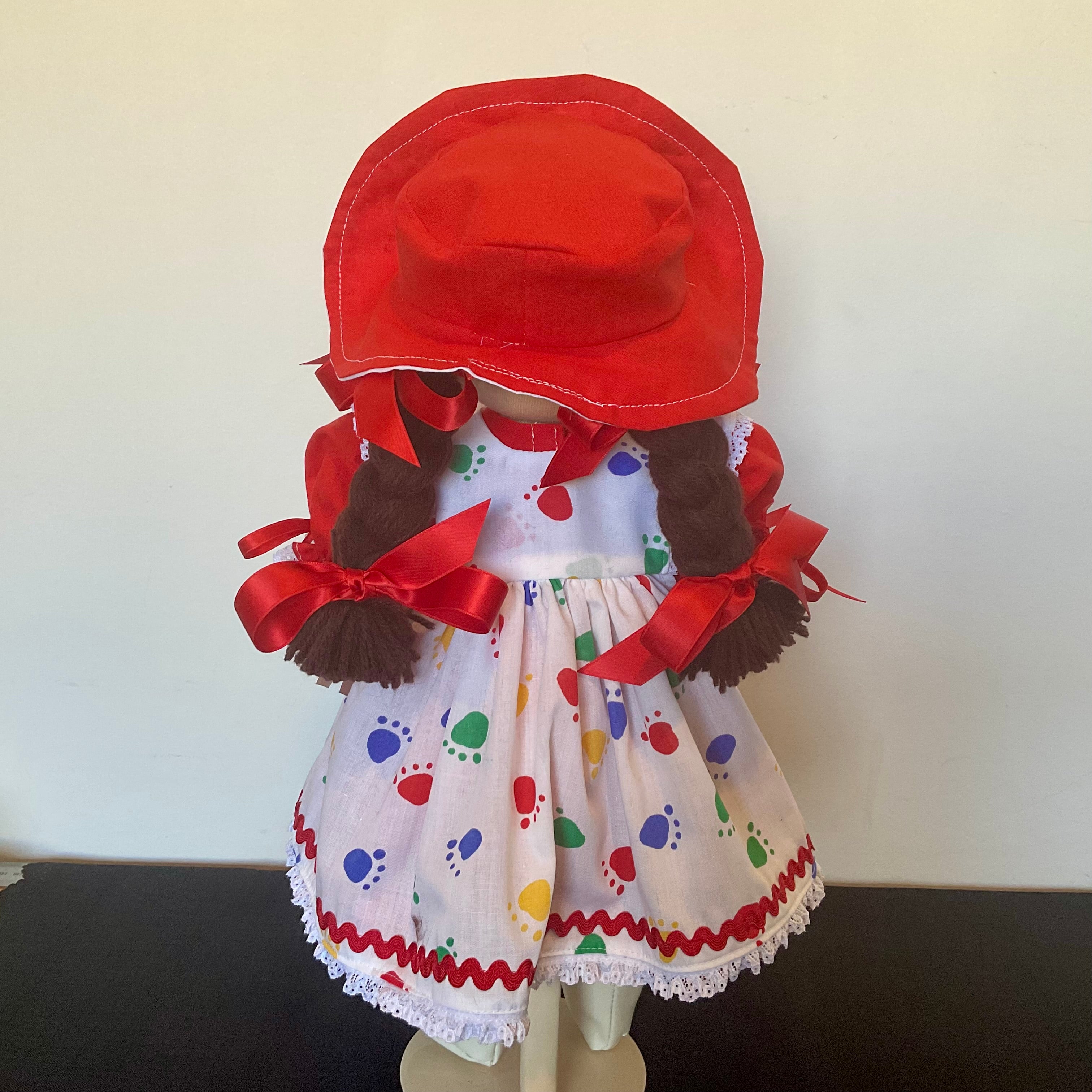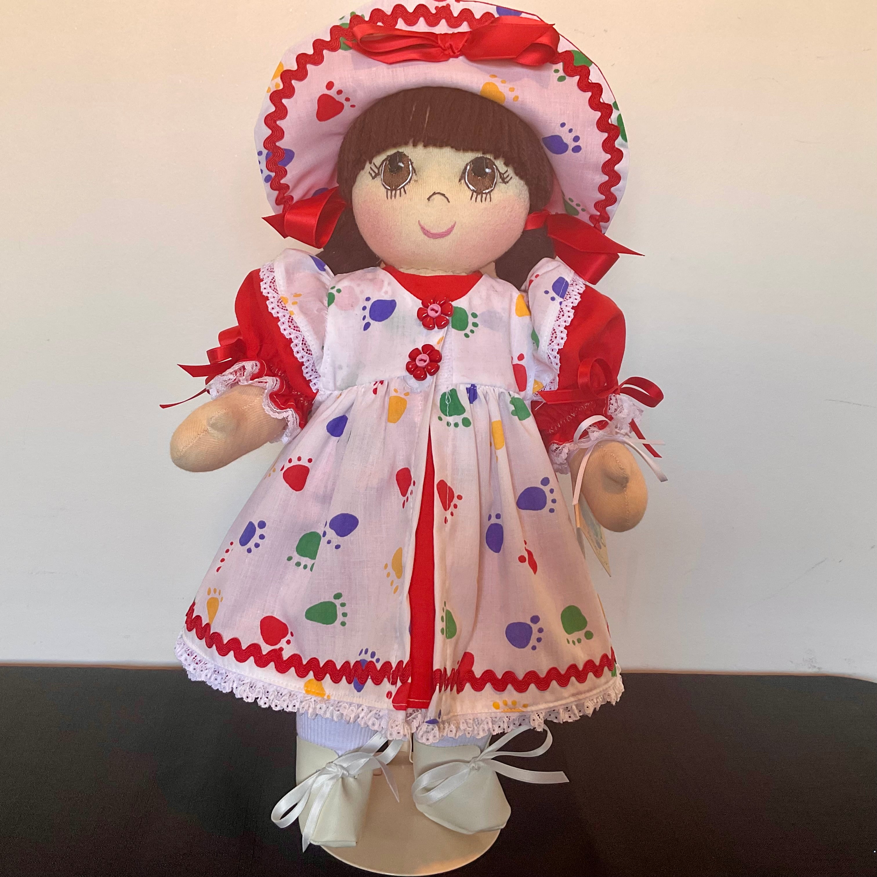 Emmeline has brown eyes and dark brown yarn hair fashioned into plaits anda fringe and is wearing a beautiful bright red lace trimmed underdress with puffed sleeves and matching panties. Her overdress or pinafore is in a novelty paw print contrasting fabric and features flutter sleeves ,front fastening with two novelty buttons it has a RicRac trim and she has a matching hat and ribbons in her hair. She also wears white handmade socks and shoes. Emmeline has attached limbs ,and is easily dressed She sits well and is washable and durable and suitable for all children.