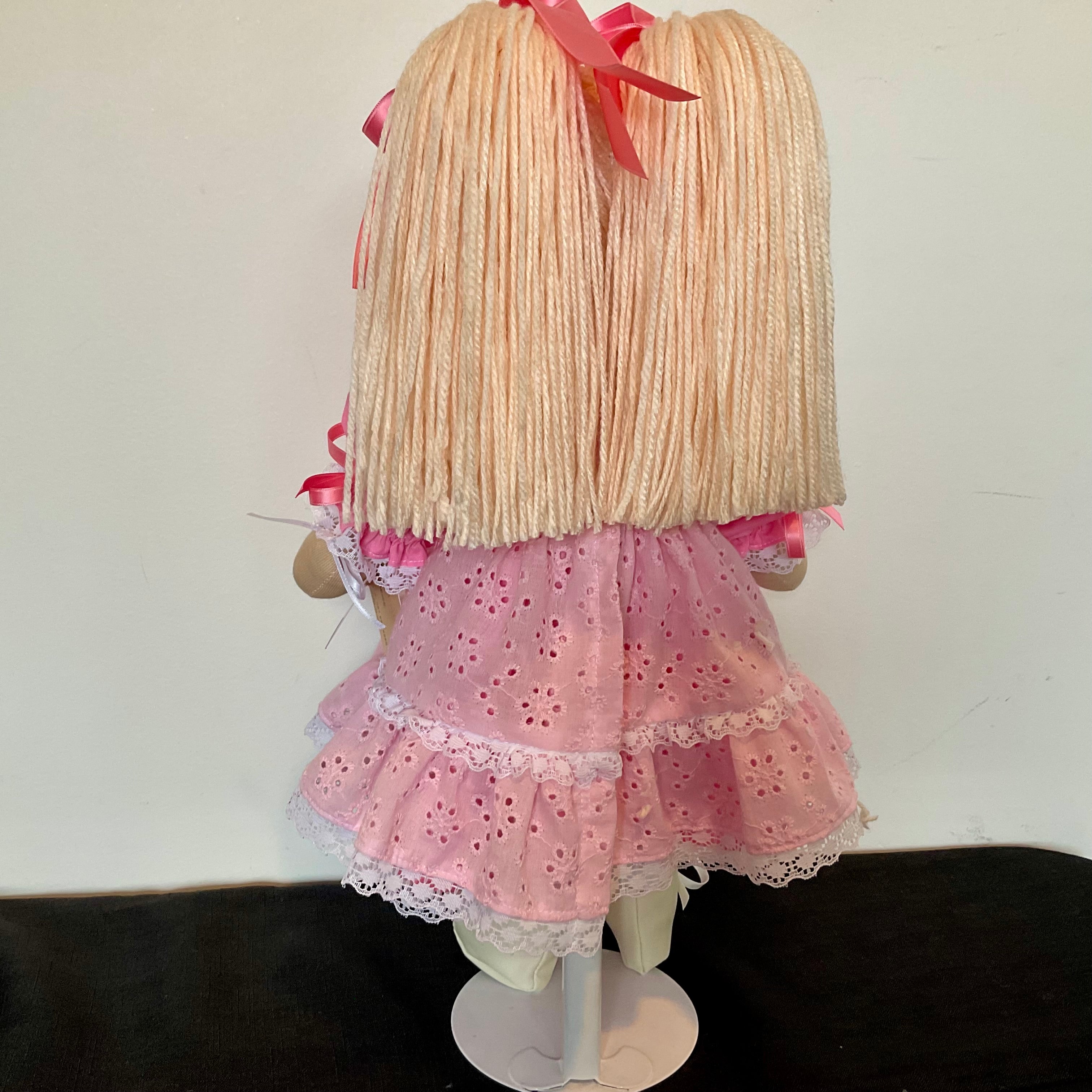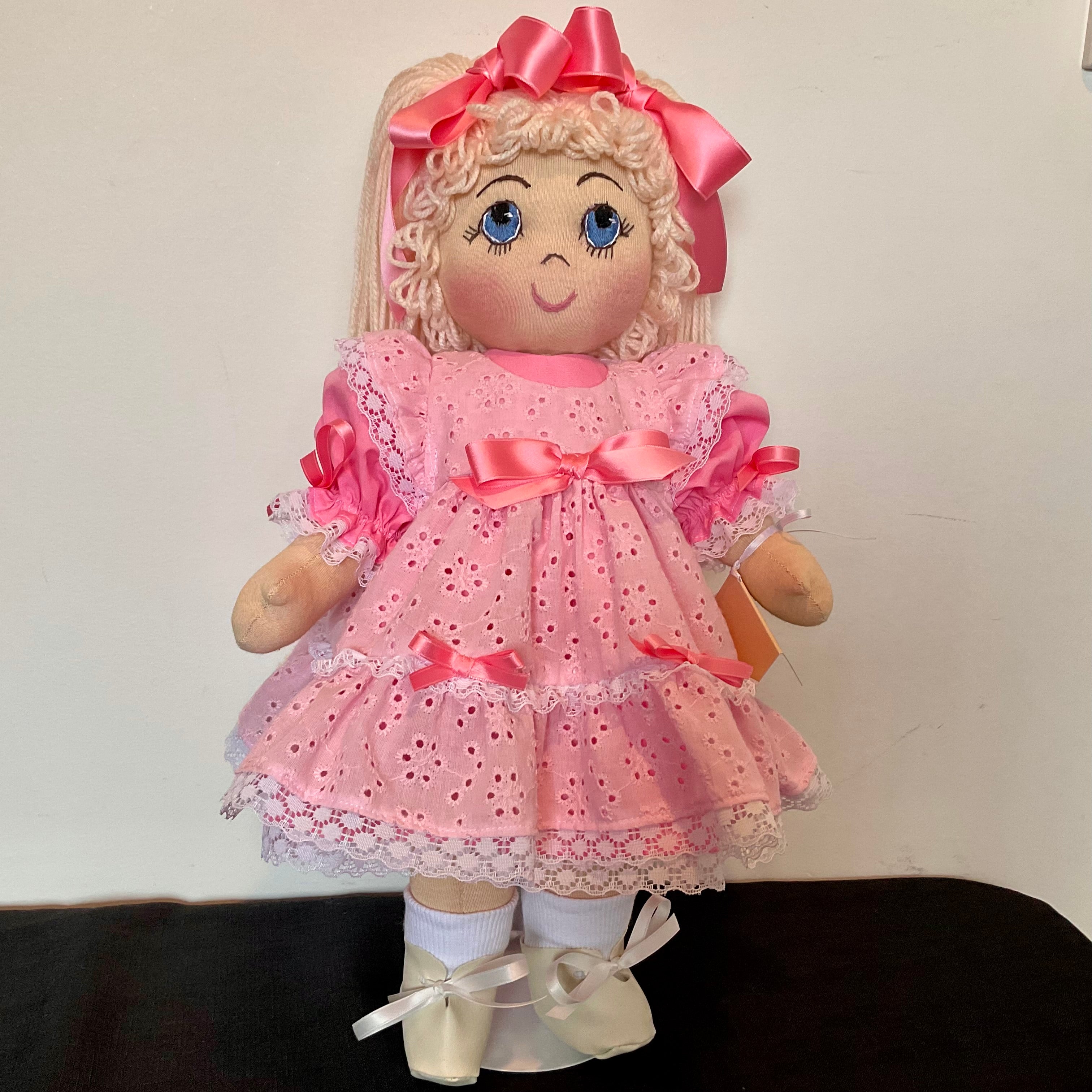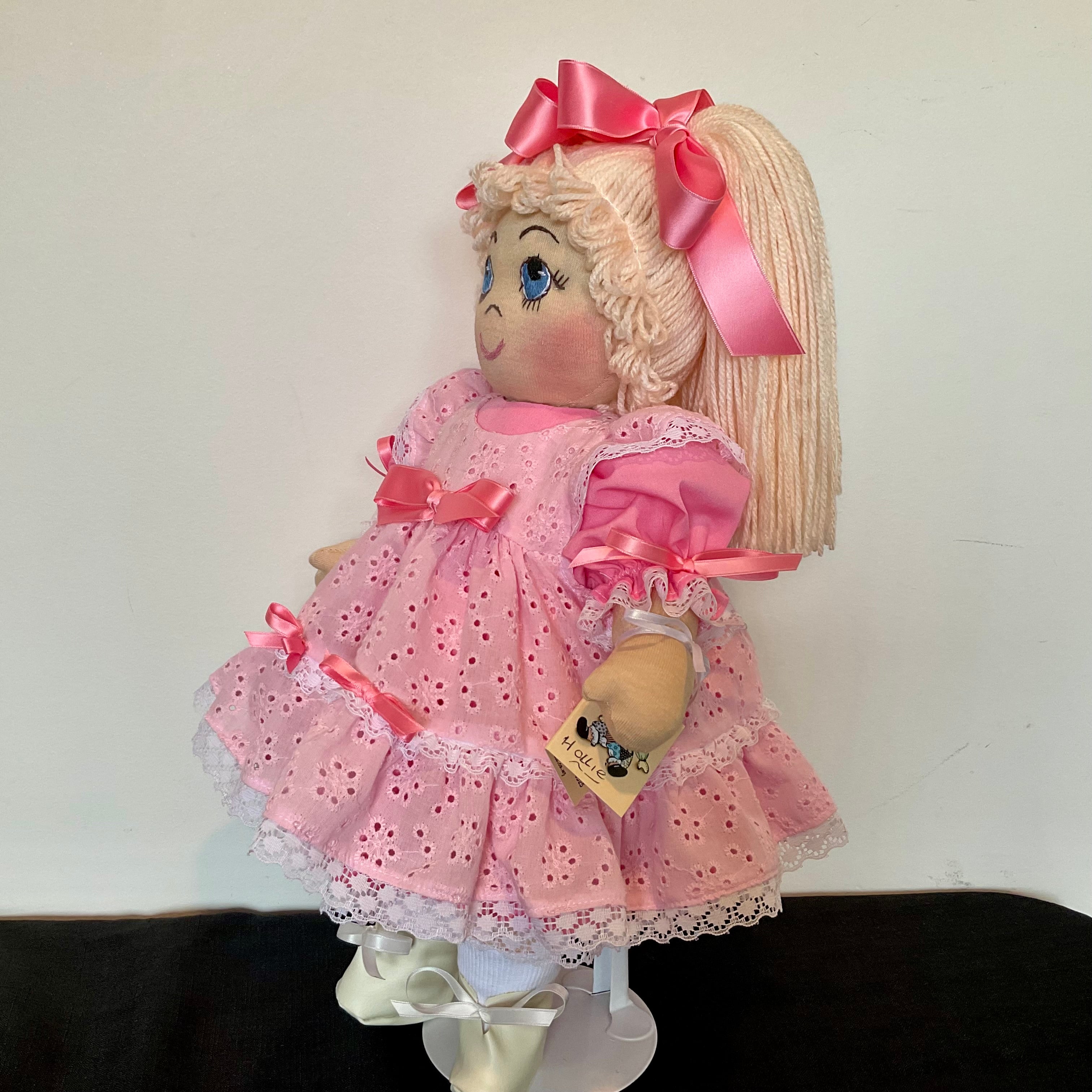 Hollie has blue eyes and blonde yarn hair fashioned into two ponytails and curls around her face and is wearing a gorgeous soft pink lace trimmed and added lace hemline underdress with puffed sleevesl7 and matching panties. Her overdress or pinafore is in a lovely pink Broderie Anglaise fabric featuring lace trimmed flutter sleeves added lace and trim and a bow on the bodice. The pinafore also has a ruffled hemline She has matching Ribbons in her hair. She also wears white handmade socks and shoes. Hollie has attached limbs and is easily dressed and undressed ,she sits well and is washable and durable and suitable for all children.