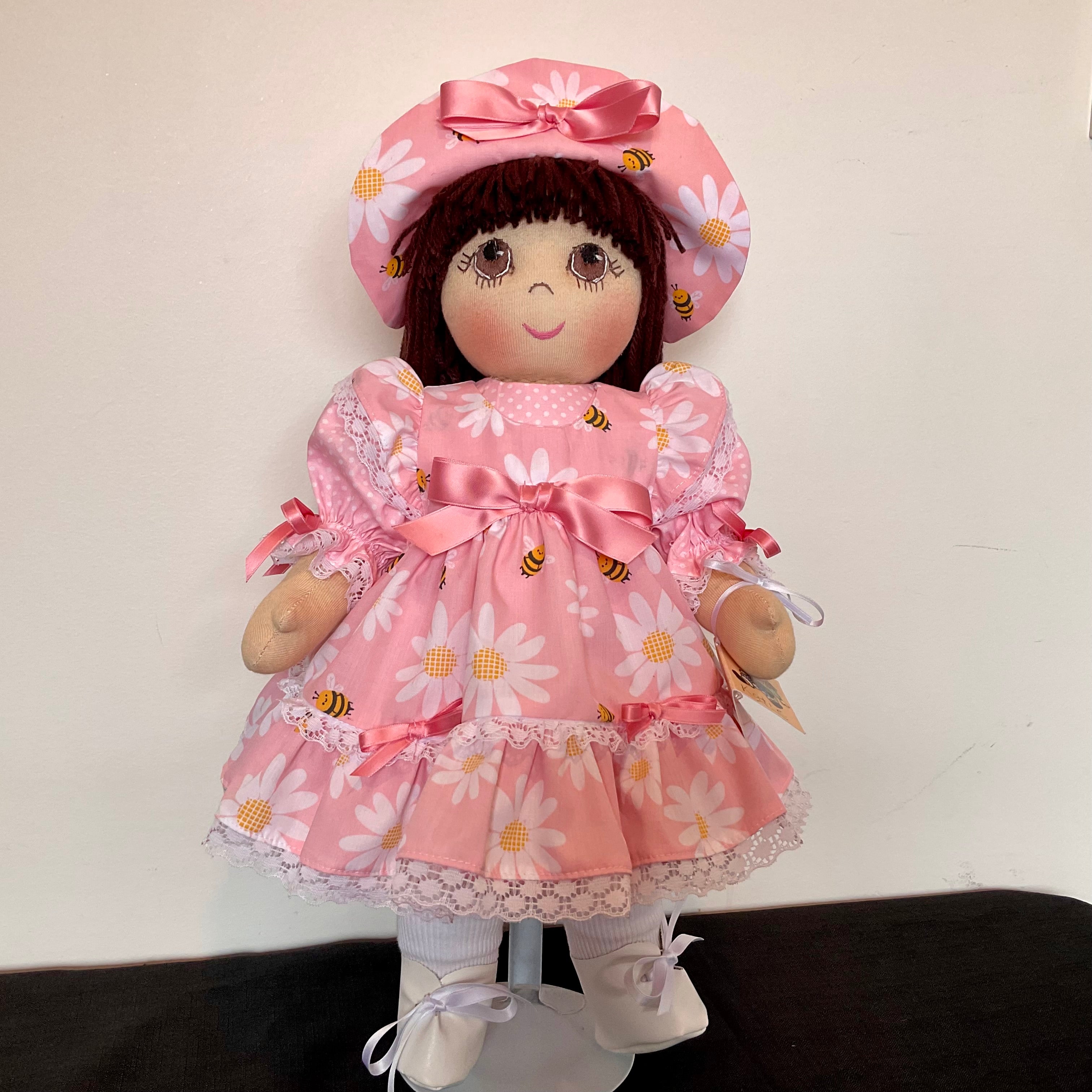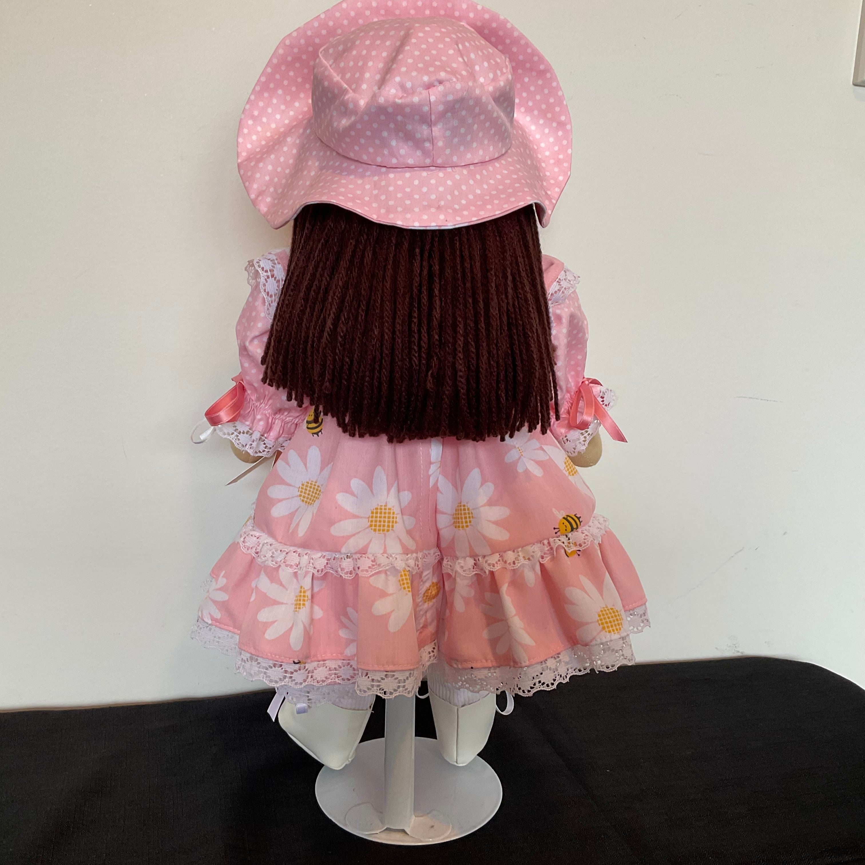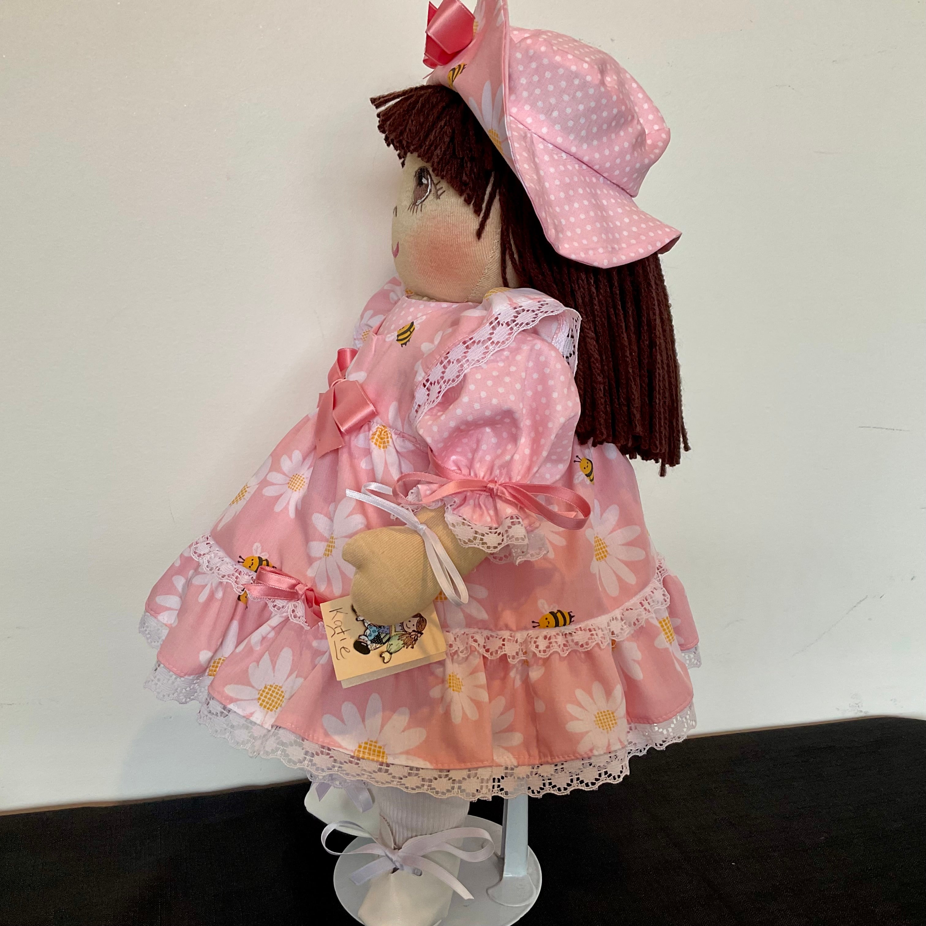Kate has brown eyes and dark brown yarn hair fashioned into a long bob and a fringe and is wearing a beautiful pink/peach and white spot underdress with puffed sleeves and matching panties. Her overdress or pinafore is in a daisy and bee patterned fabric in Pink/peach ,with flutter sleeves and a ruffled hemline. It is adorned with white lace ,and has a bow on the bodice. She has a matching hat and is also wearing white handmade socks and shoes. She has matching ribbons in her hair. Kate has attached limbs and is easily dressed and undressed. She sits well and is washable and durable and suitable for all children