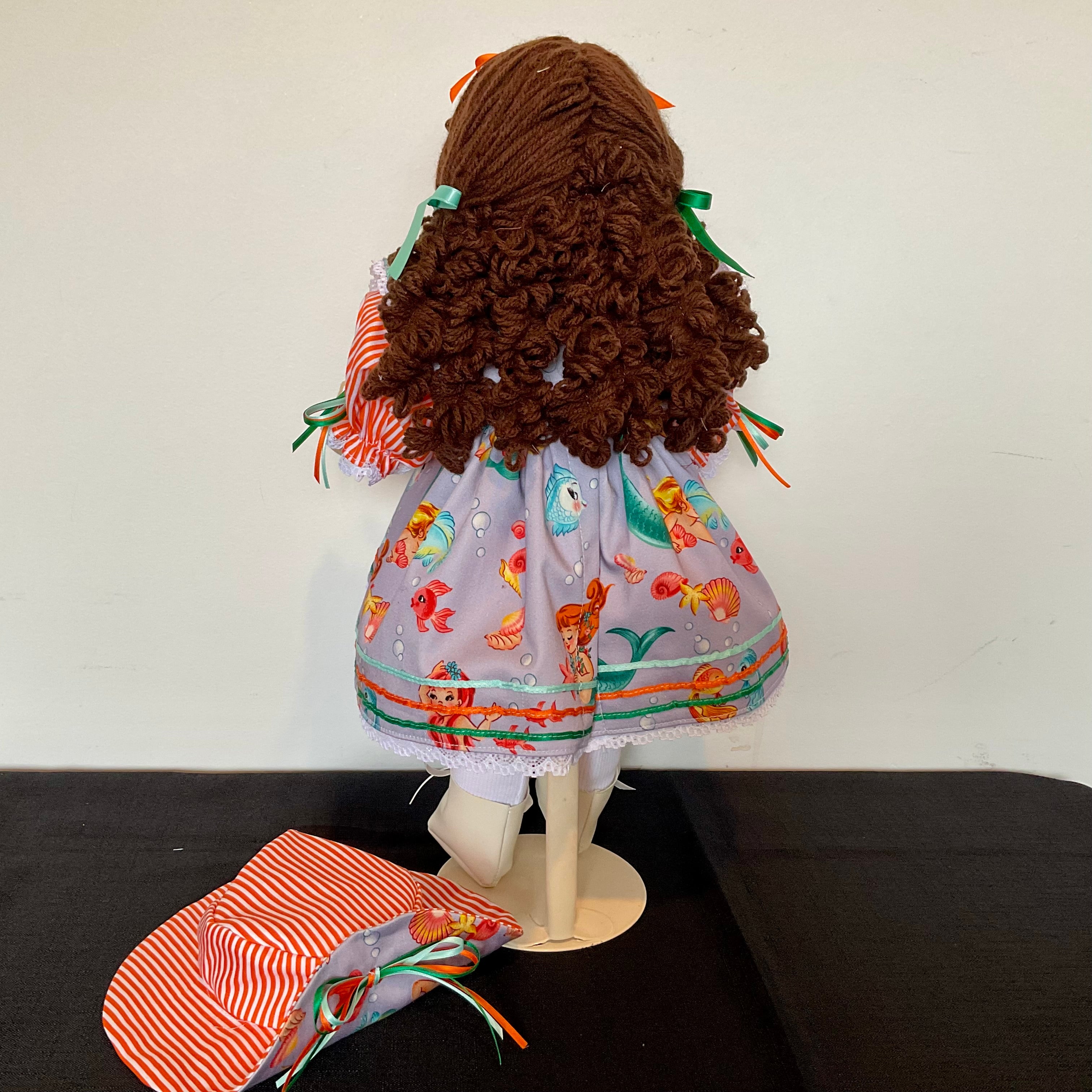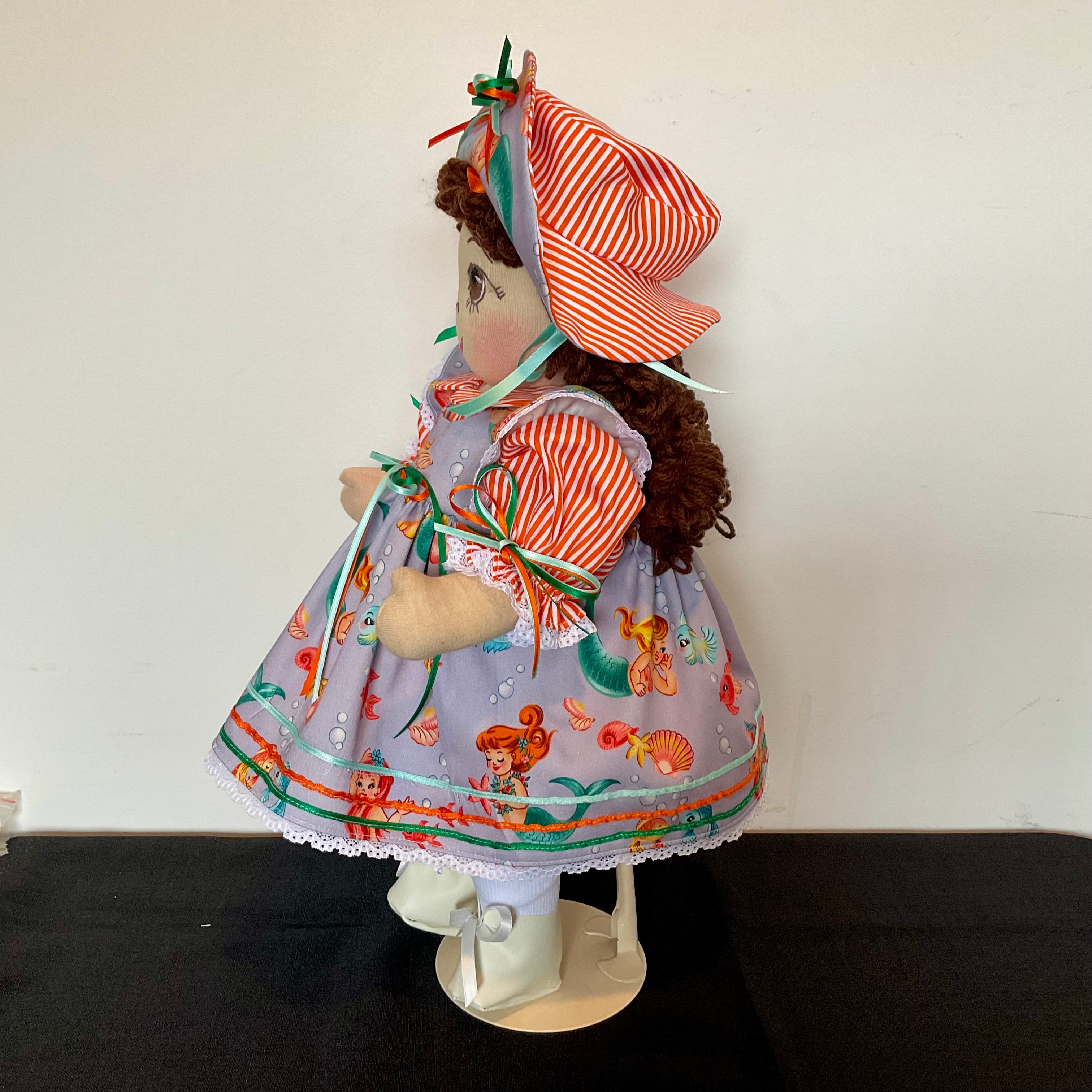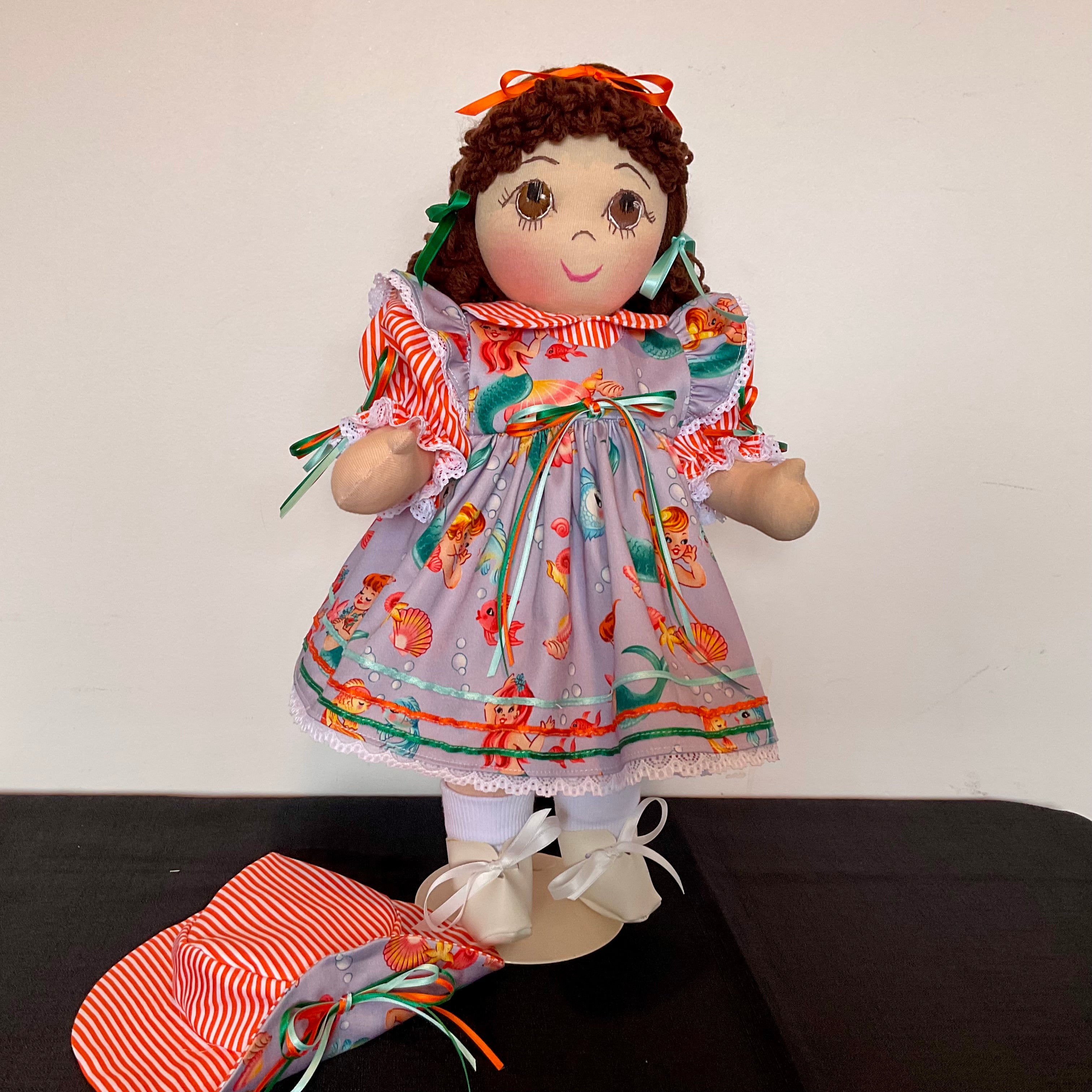 Marina has brown eyes and dark brown yarn hair fashioned into long ringlets and curls around her face. and is wearing a beautiful tangerine and white striped underdress with puffed sleeves and a PeterPan collar  and matching panties. Her overdress or pinafore is in a delightful  Mermaid  themed fabric ,featuring flutter sleeves and a lace trimmed and beribboned hemline. She has a ribbons on the bodice and a matching hat and ribbons in her hair.   She also wears white handmade socks and shoes. Marina has attached limbs and is easily dressed and undresssed.  She sits well and is washable and durable and suitable for all children.